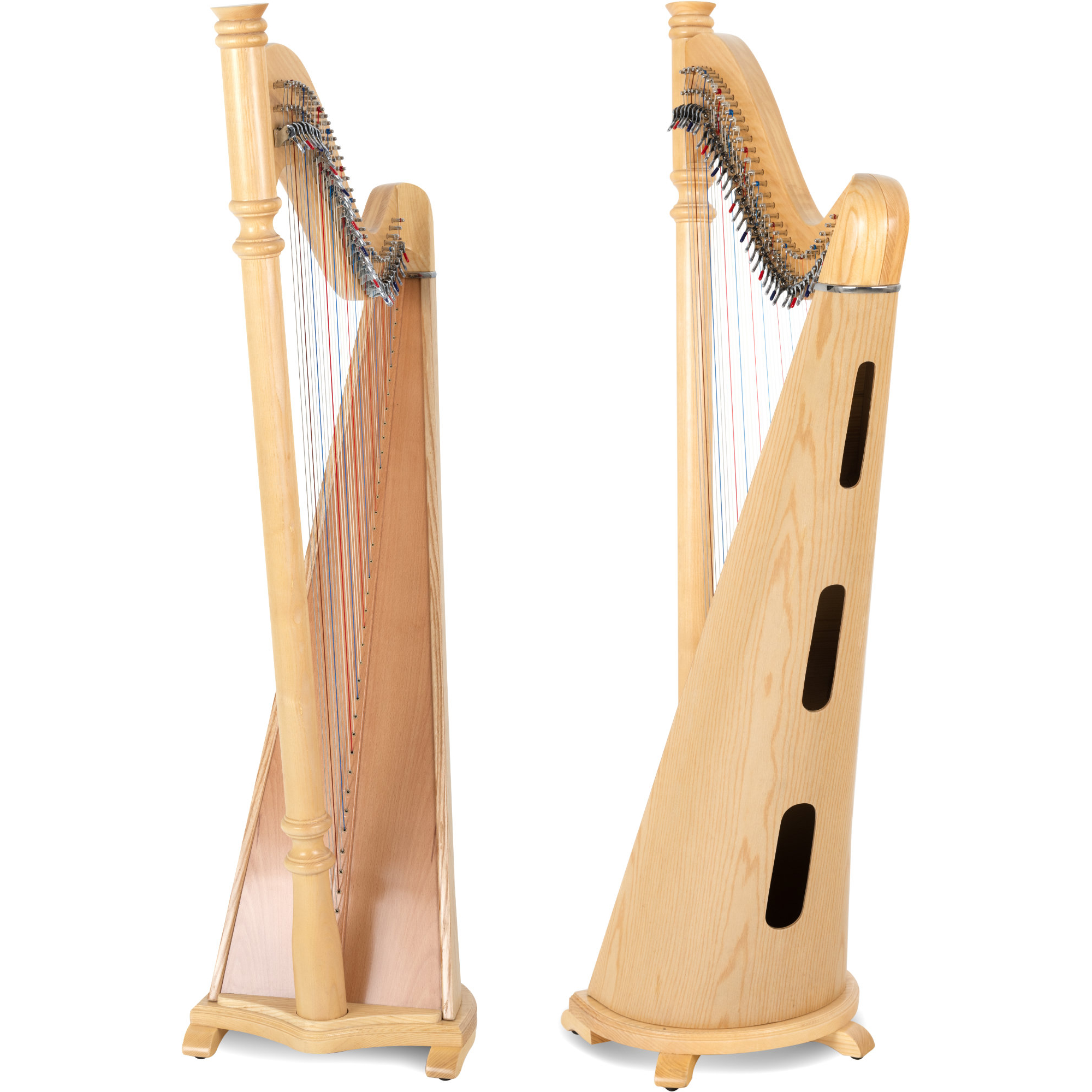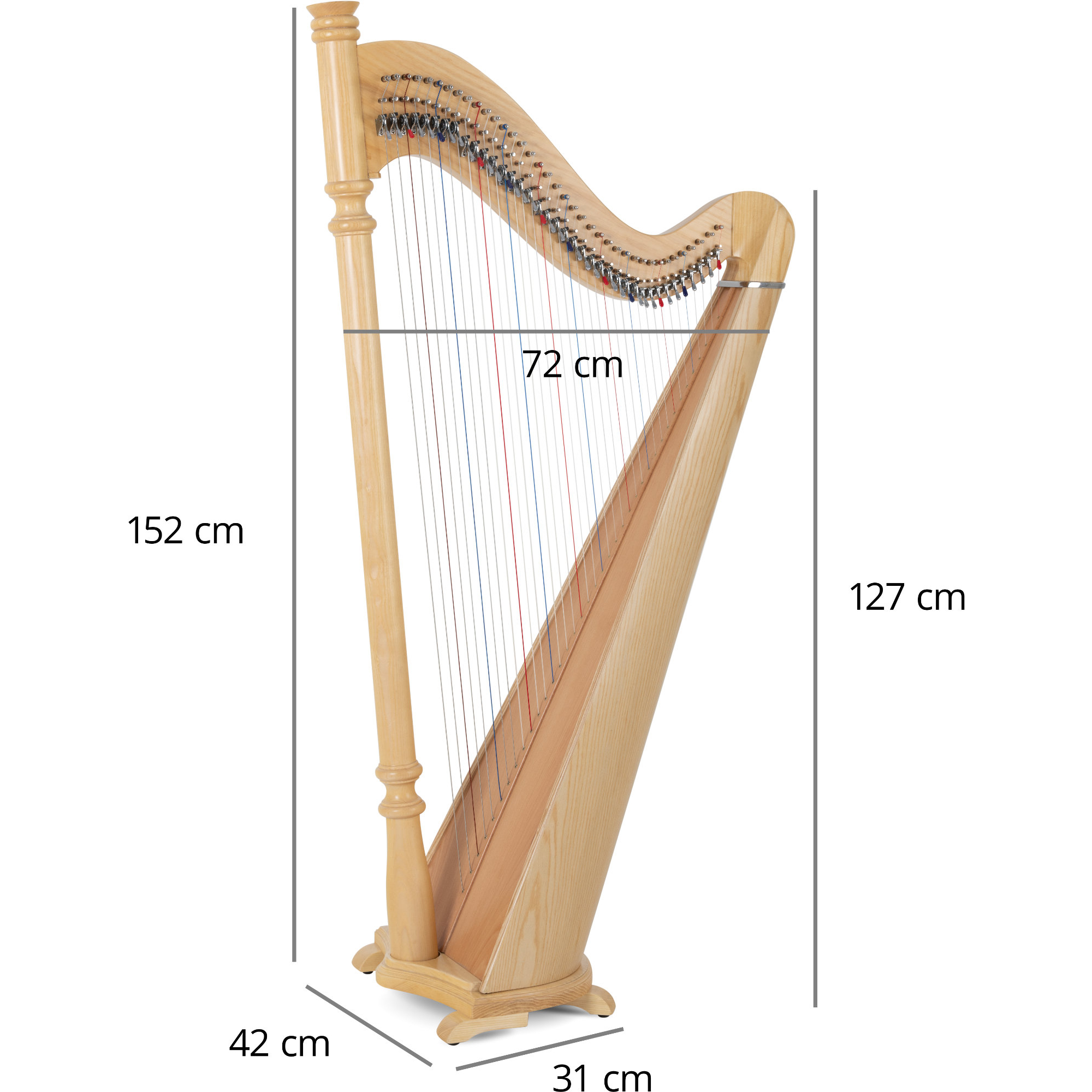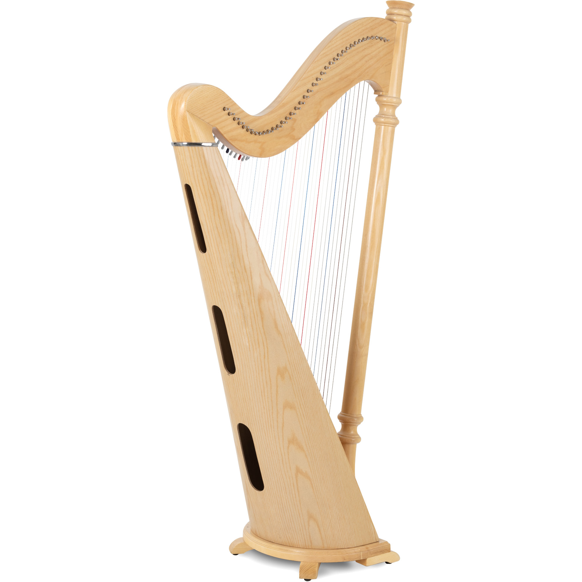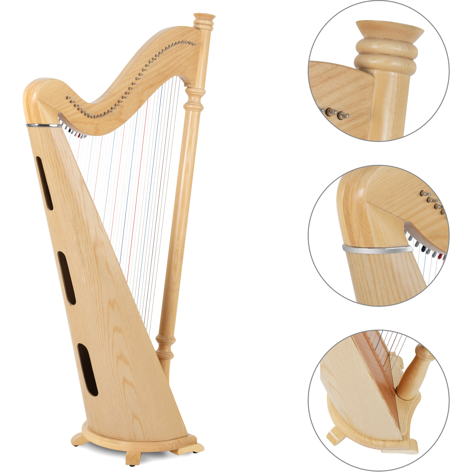 Der Klangkörper aus hochwertigem Eschenholz strahlt eine natürliche Schönheit und Eleganz aus. Das Holz verleiht der Harfe nicht nur eine warme Klangfarbe, sondern auch eine robuste Konstruktion, die für Langlebigkeit und Stabilität sorgt. Die Decke besteht aus Fichtenholz, welches aufgrund seines ausgeprägten Resonanzverhaltens besten Klang und Dynamik bietet.
