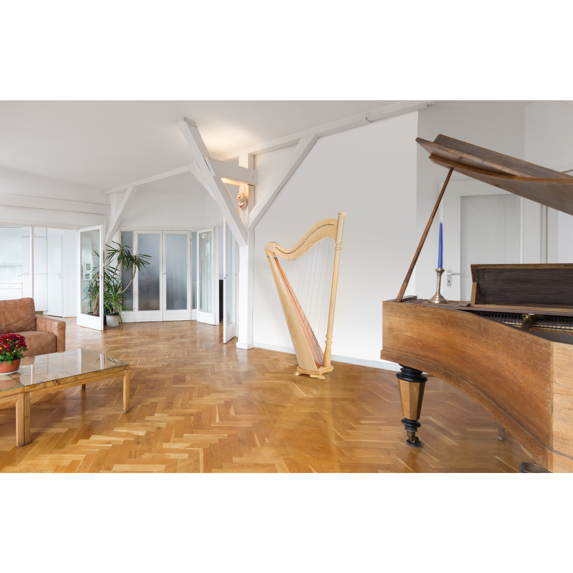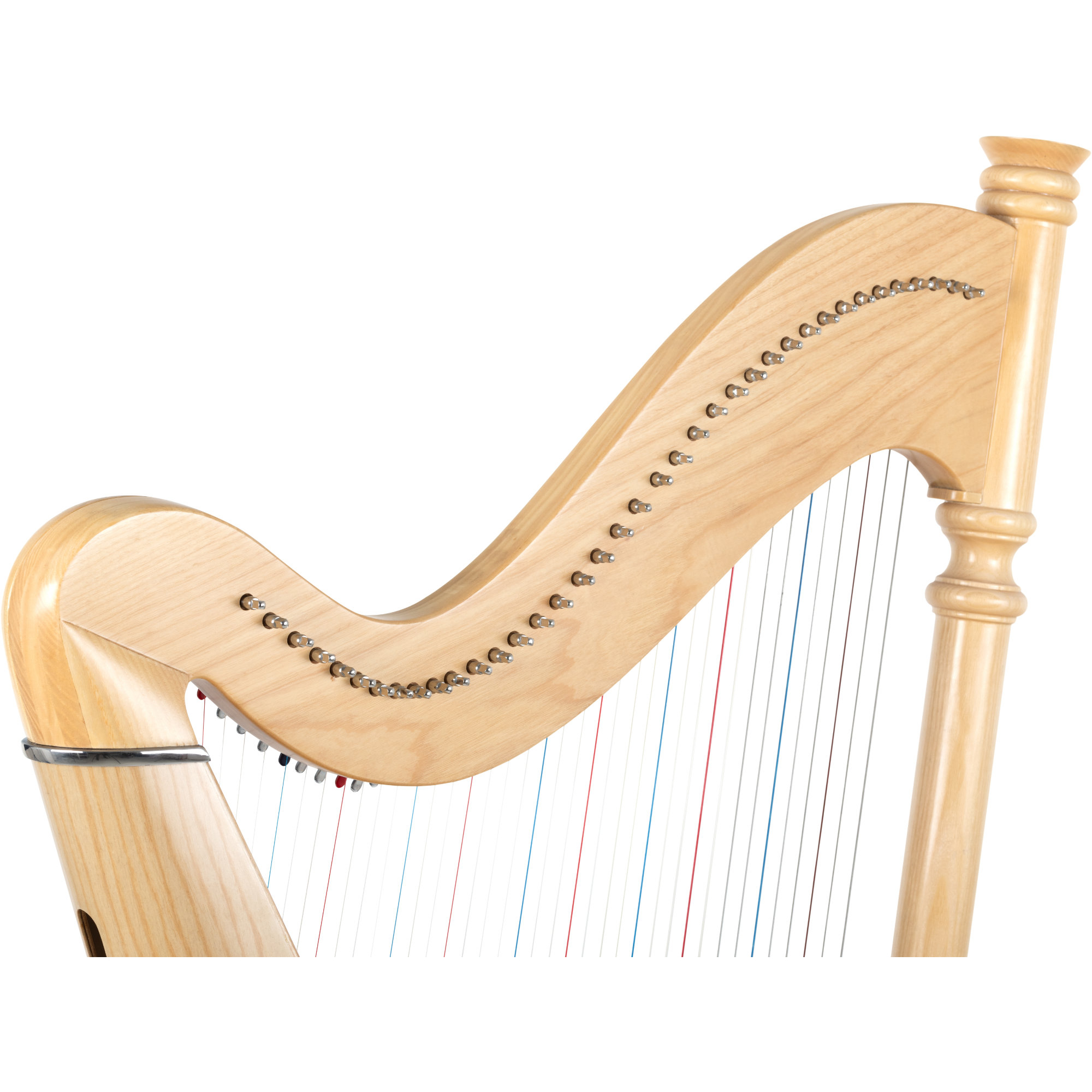 Ein zentrales Element der Harfe ist die gedrechselte Säule aus Buchenholz, welche für eine hohe Steifigkeit des gesamten Instruments und somit verbesserte Schwingungsübertragung der Saiten sorgt. Die Harfe besitzt mit 38 Saiten einen Tonumfang von über 6 Oktaven (A, - c''''). Von Volksmusik bis hin zu Werken Klassischer Komponisten ist mit dieser Harfe bereits eine große Bandbreite an Stücken spielbar.