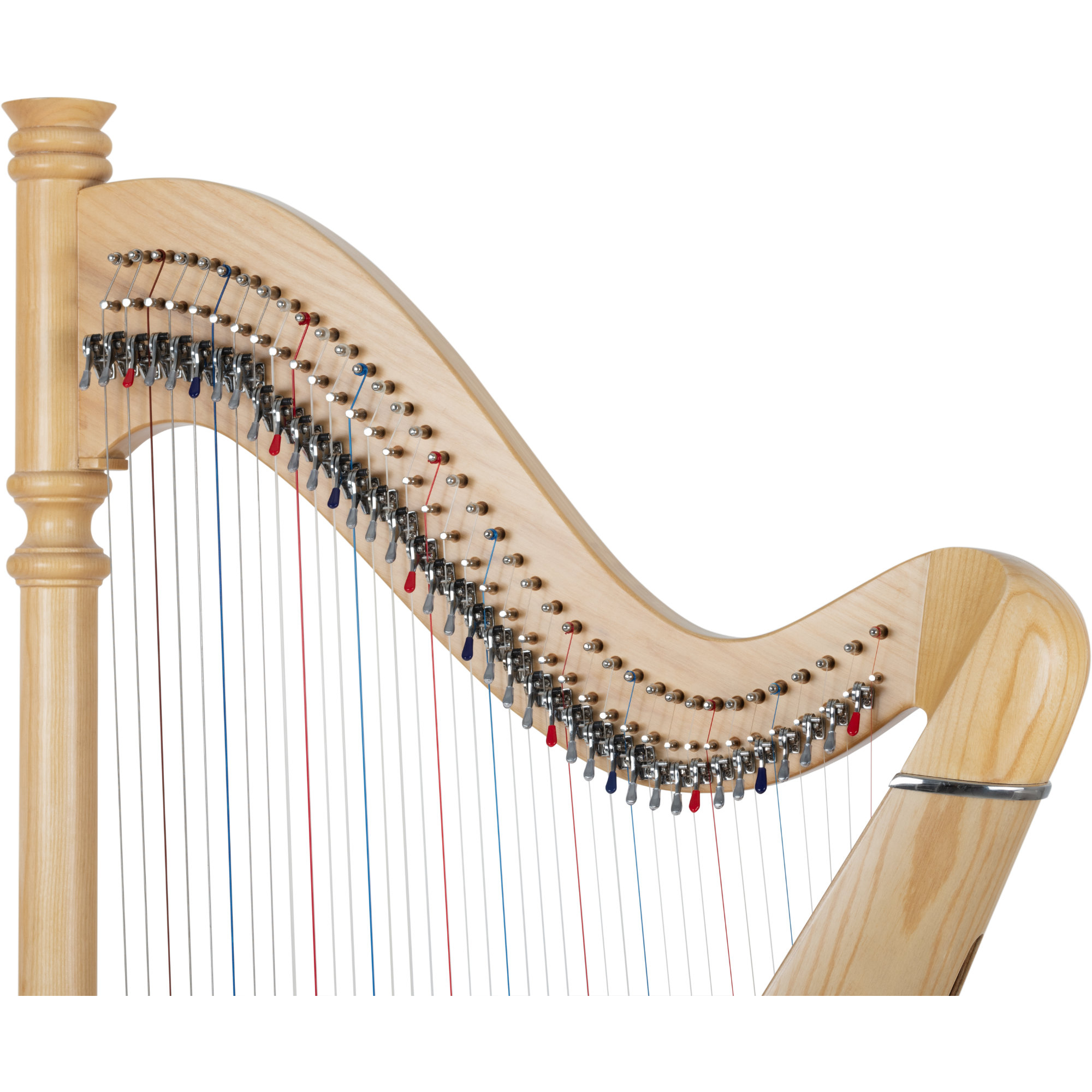Die 38 Saiten werden diatonisch in Es-Dur gestimmt, wobei die roten und blauen Saiten anzeigen, wo sich die Töne C und F befinden. Durch das Hochklappen der jeweiligen farblich gekennzeichneten Haken wird die Harfe schnell auf eine andere Tonart umgestimmt, wodurch man sehr flexibel mit anderen musizieren kann.