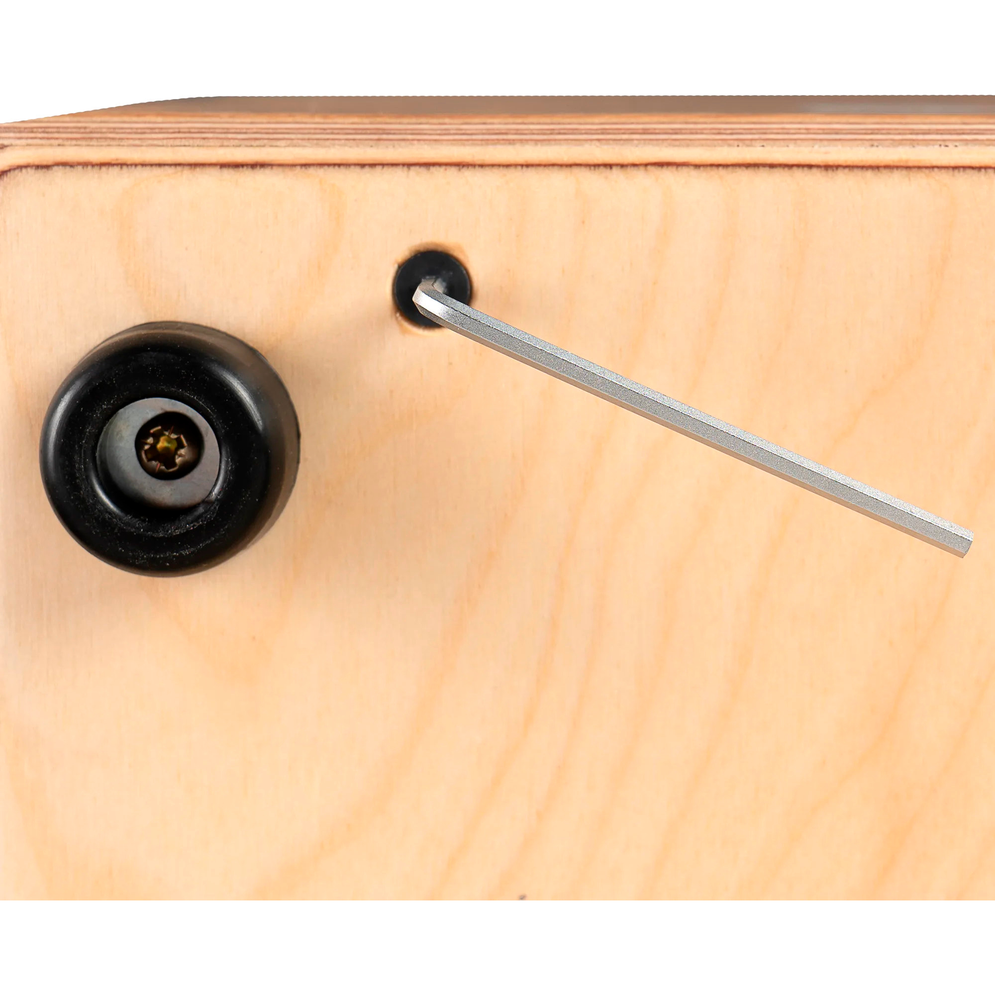 Met de inbussleutel kun je aan de onderkant van het cajon de spanning van de snaredraden aanpassen en daarmee de snareklank veranderen door ze strakker of losser te draaien. Ook kun je de íons met de inbussleutel verwisselen.