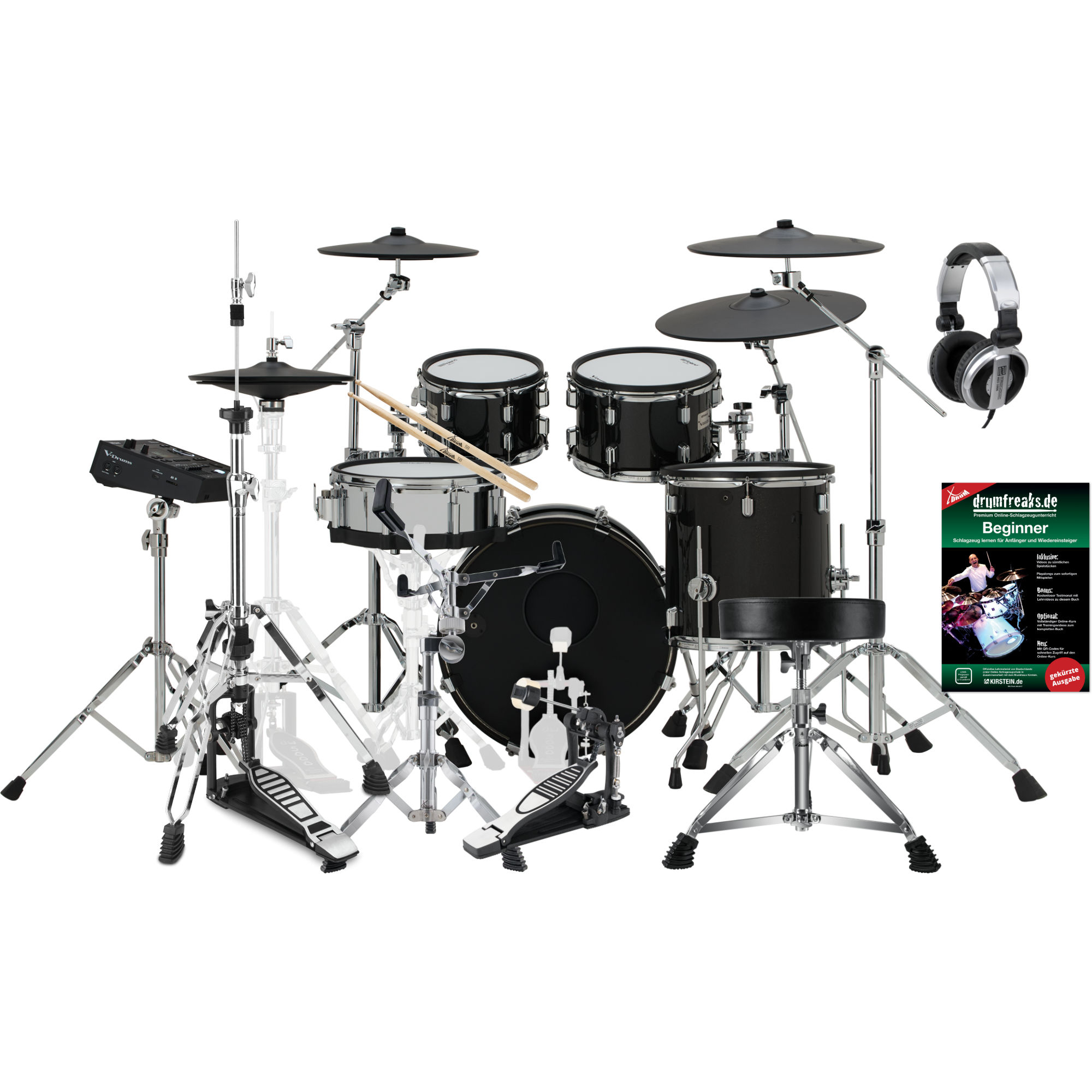 - Compleet, dubbelstijlig tom- en bekkens-hardware-setup zoals bij een akoestische set (hi-hatstatief, bassdrumpedal, snarestatief en drumkruk apart verkrijgbaar)