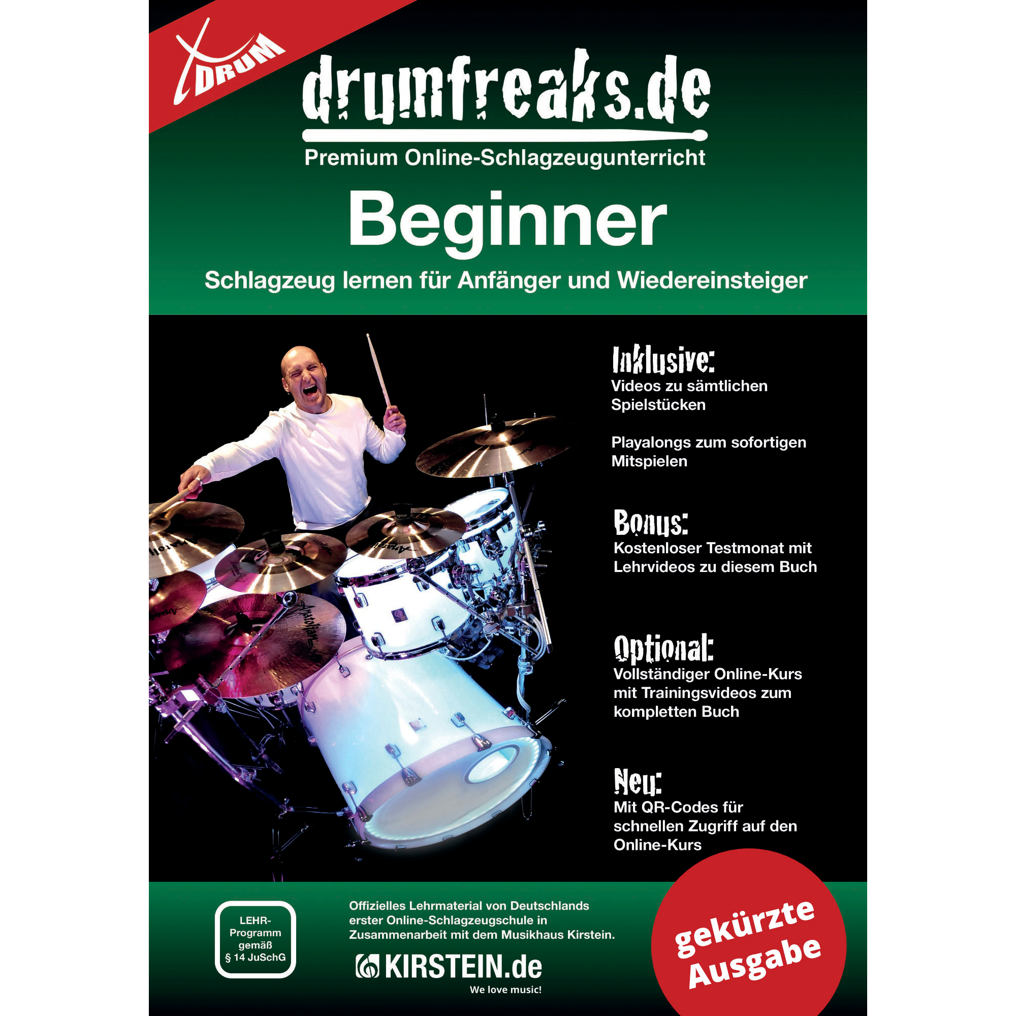 De "Beginner"-methode van drumfreaks.de bevat in de Kirstein-editie de belangrijkste basisprincipes van het drummen. Het begint bij de juiste stokhouding en eindigt bij de eerste echte grooves. Uitgebreide video's begeleiden je op weg naar drummer worden.
