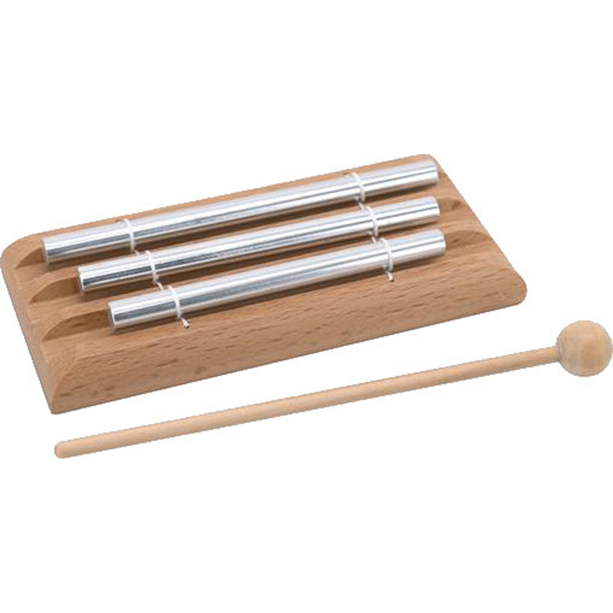 6 paar metalen schellen aan de schellenstok produceren vrolijke klanken, terwijl het houten handvat in kindformaat kleine muzikanten aanmoedigt geluiden na te bootsen zoals het rammelen van een ratelslang. De drie op elkaar afgestemde klankstaven (C-E-G) van de chimes produceren harmonische klanken die zich ideaal lenen voor eerste muzikale experimenten.