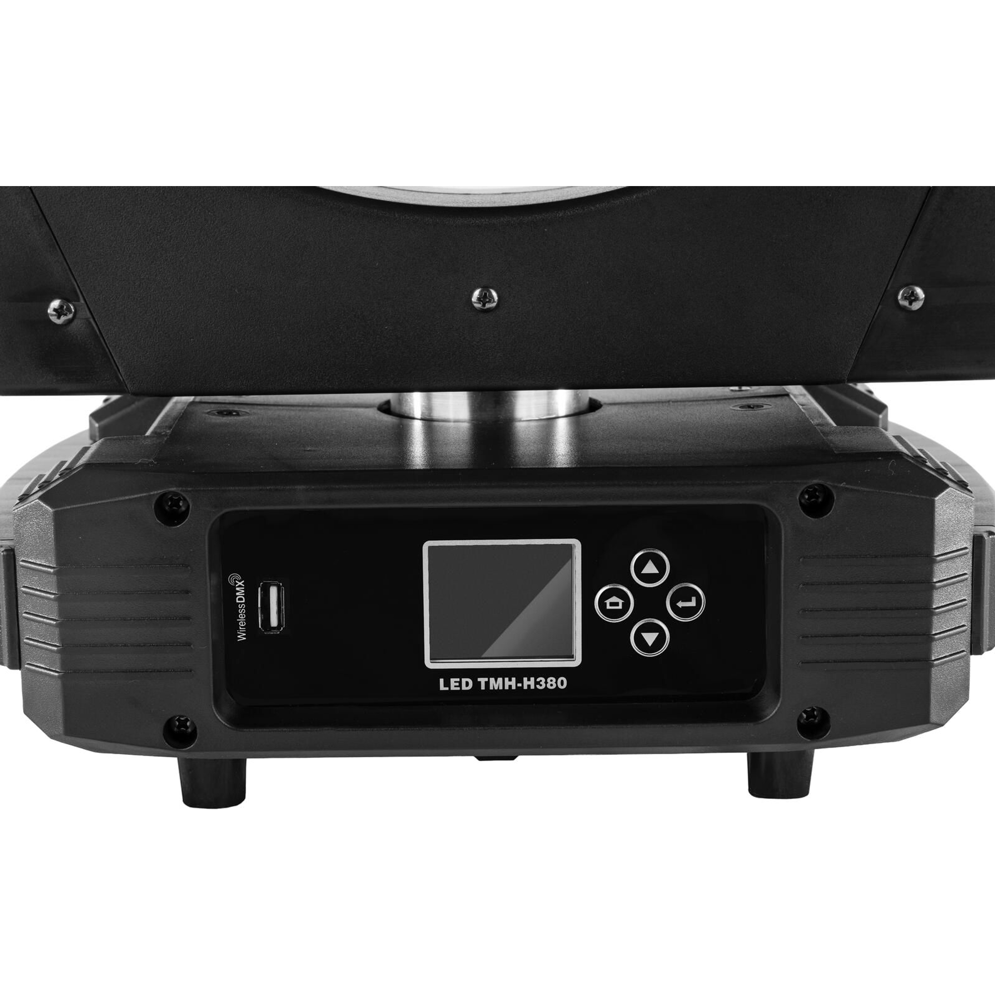 Ook mechanisch is de TMH-H380 ontworpen voor professioneel gebruik. De metalen behuizing, twee robuuste draaggrepen, vier rubberen voetjes en de inbegrepen Omega-beugels ondersteunen flexibel gebruik staand of hangend. Voor efficiënte stroomverdeling heeft het toestel een netaansluiting via P-Con en een netuitgang om tot 8 apparaten te schakelen. De koeling gebeurt via één ventilator in de base en twee temperatuurgereguleerde ventilatoren in de kop. Met IP20 is het model bedoeld voor gebruik binnenshuis. Afmetingen (BxDxH): 34 x 22,5 x 34,5 cm. Gewicht: 11,10 kg. Daarmee is deze moving-head een sterke keuze voor professionele lichtconcepten met veel veelzijdigheid en duidelijke systeemintegratie.