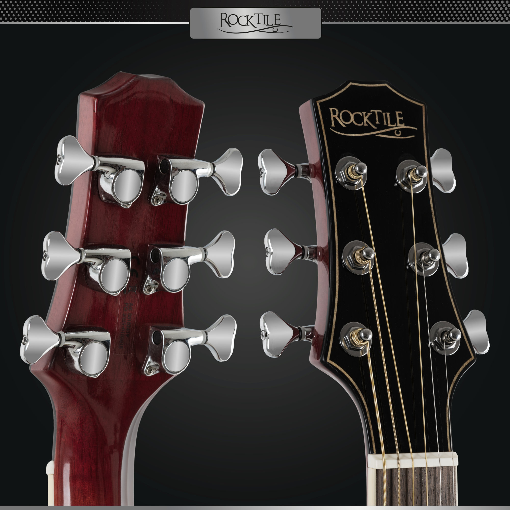 Het geïntegreerde cutaway maakt de hoge posities makkelijk bereikbaar en vergroot je speelmogelijkheden aanzienlijk. Gesloten drukgiet stemmechanieken zorgen voor nauwkeurig stemmen en hoge stemstabiliteit. De palissanderbrug met kunststofzadels en decoratieve zwarte pins met abalone-dots rondt de uitrusting functioneel en optisch af.