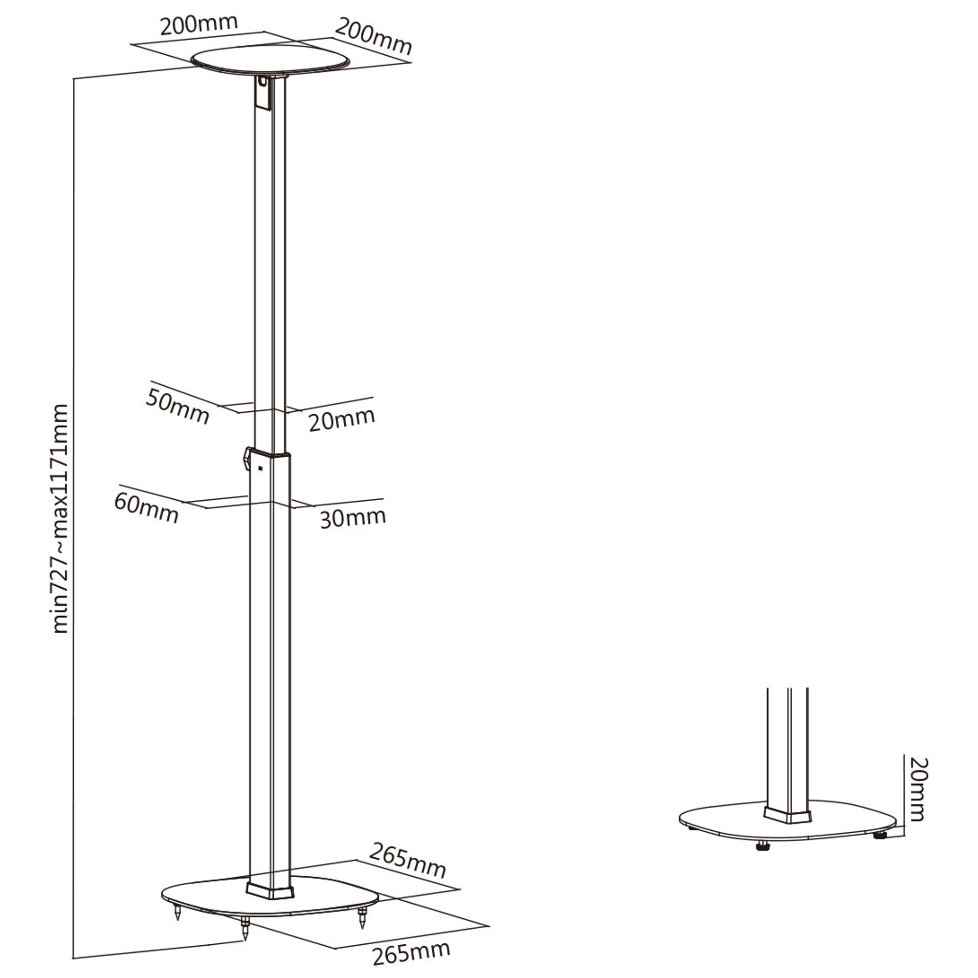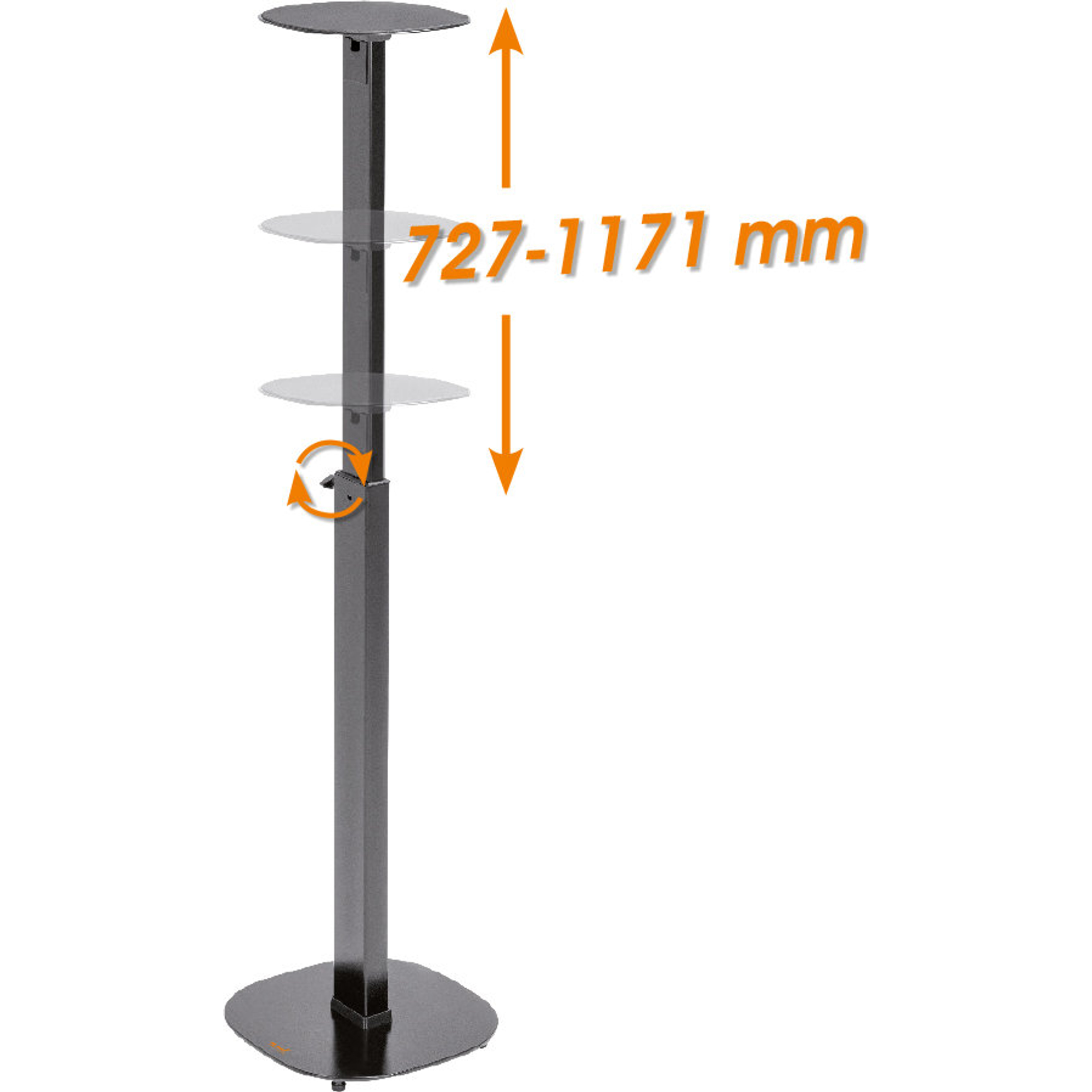 Dank de verstelbare hoogte van 727 tot 1171 mm kun je je luidsprekers precies op oorhoogte plaatsen. Zo bereik je de ideale luisterhoek en geniet je van een evenwichtige, precieze weergave. Het royale opstelvlak van 20 x 20 cm biedt ruimte voor tal van luidsprekermodellen van verschillende fabrikanten.