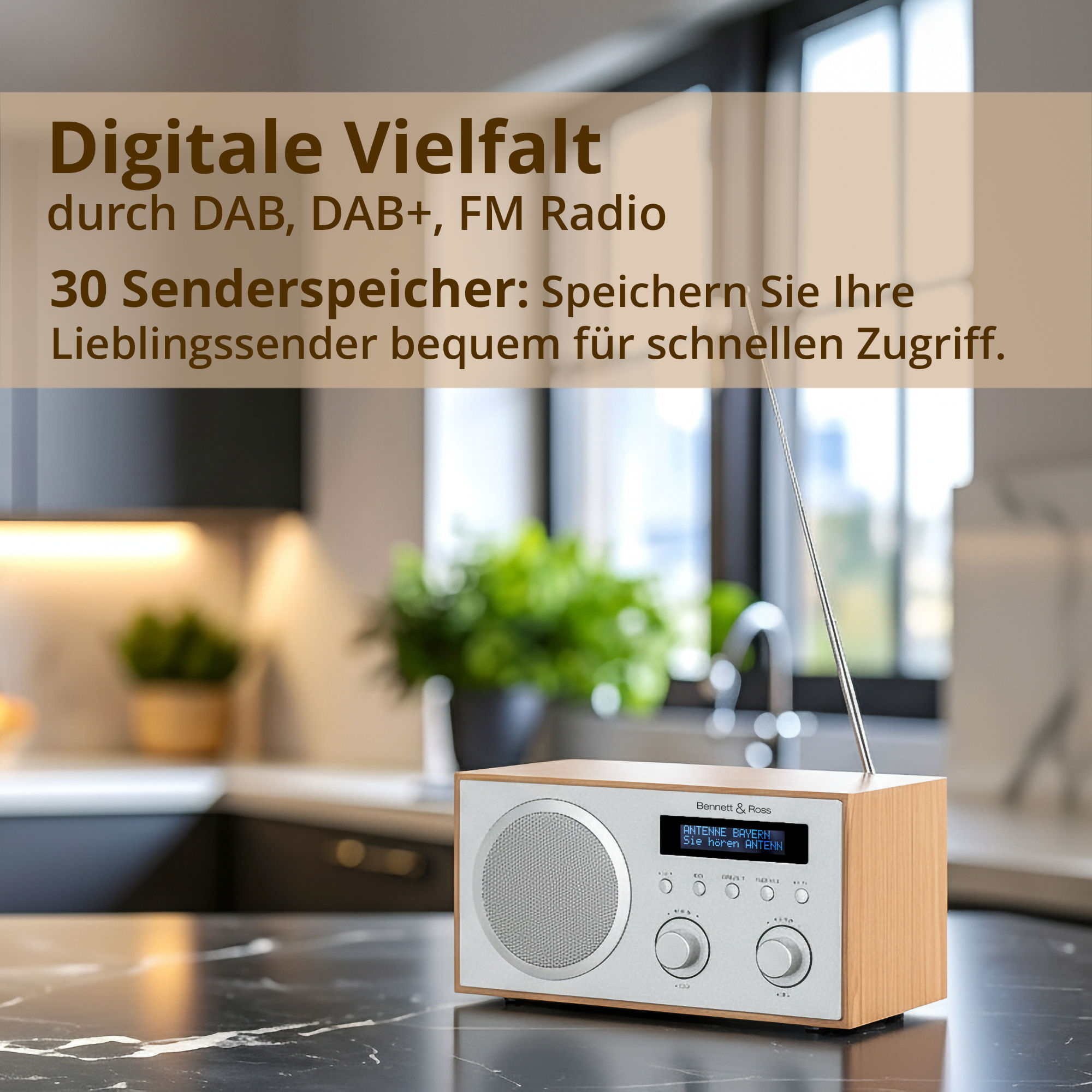 Het Bennett & Ross DAB-258 Vikedal verenigt moderne digitale technologie met klassiek design en indrukwekkende geluidskwaliteit. De digitale radio is ideaal voor iedereen die muziek, nieuws of podcasts in heldere, storingsvrije kwaliteit wil beluisteren - of het nu in de keuken, slaapkamer of op kantoor is. Met zijn elegante houten behuizing en het overzichtelijke LCD-display is het niet alleen technisch overtuigend, maar ook visueel een echte blikvanger.