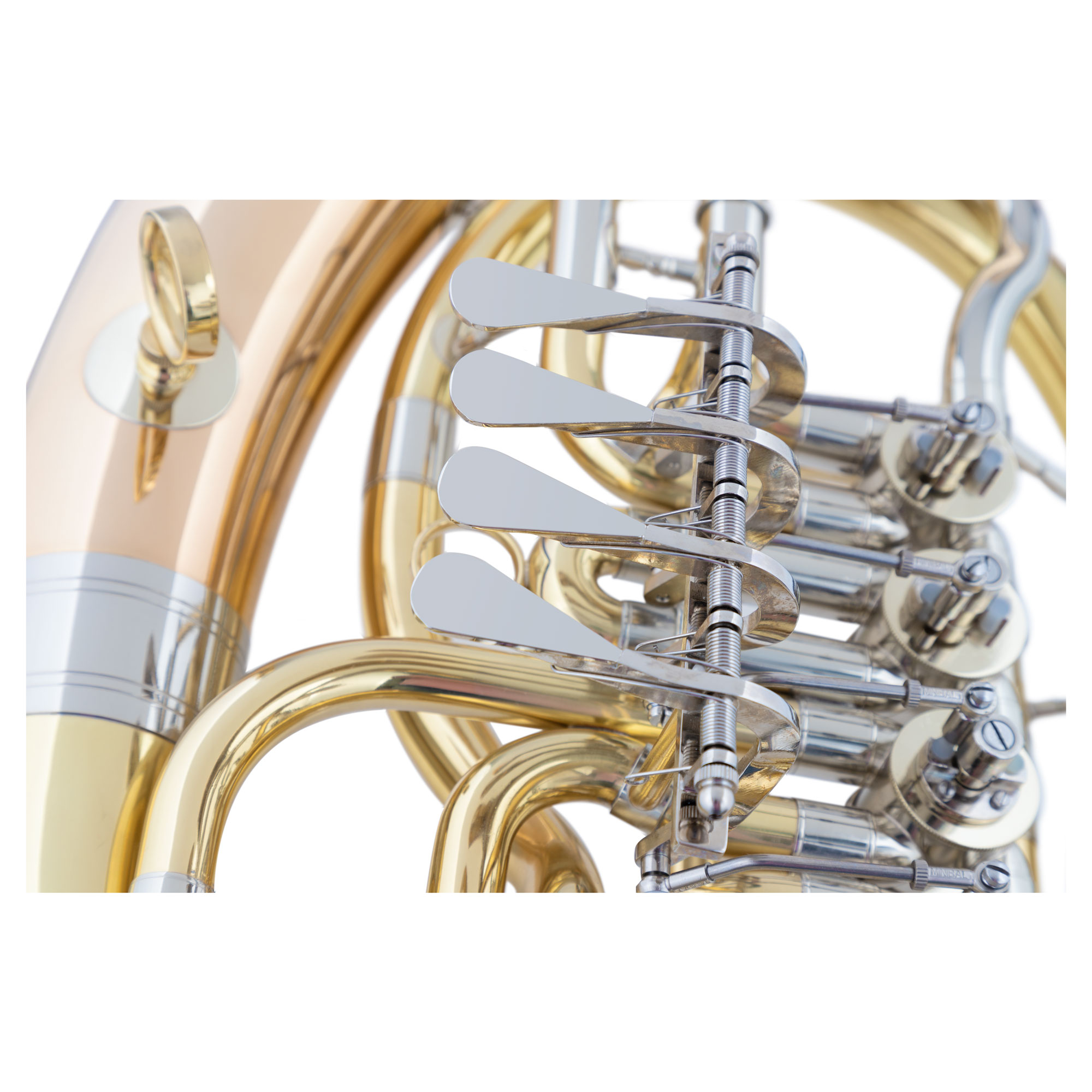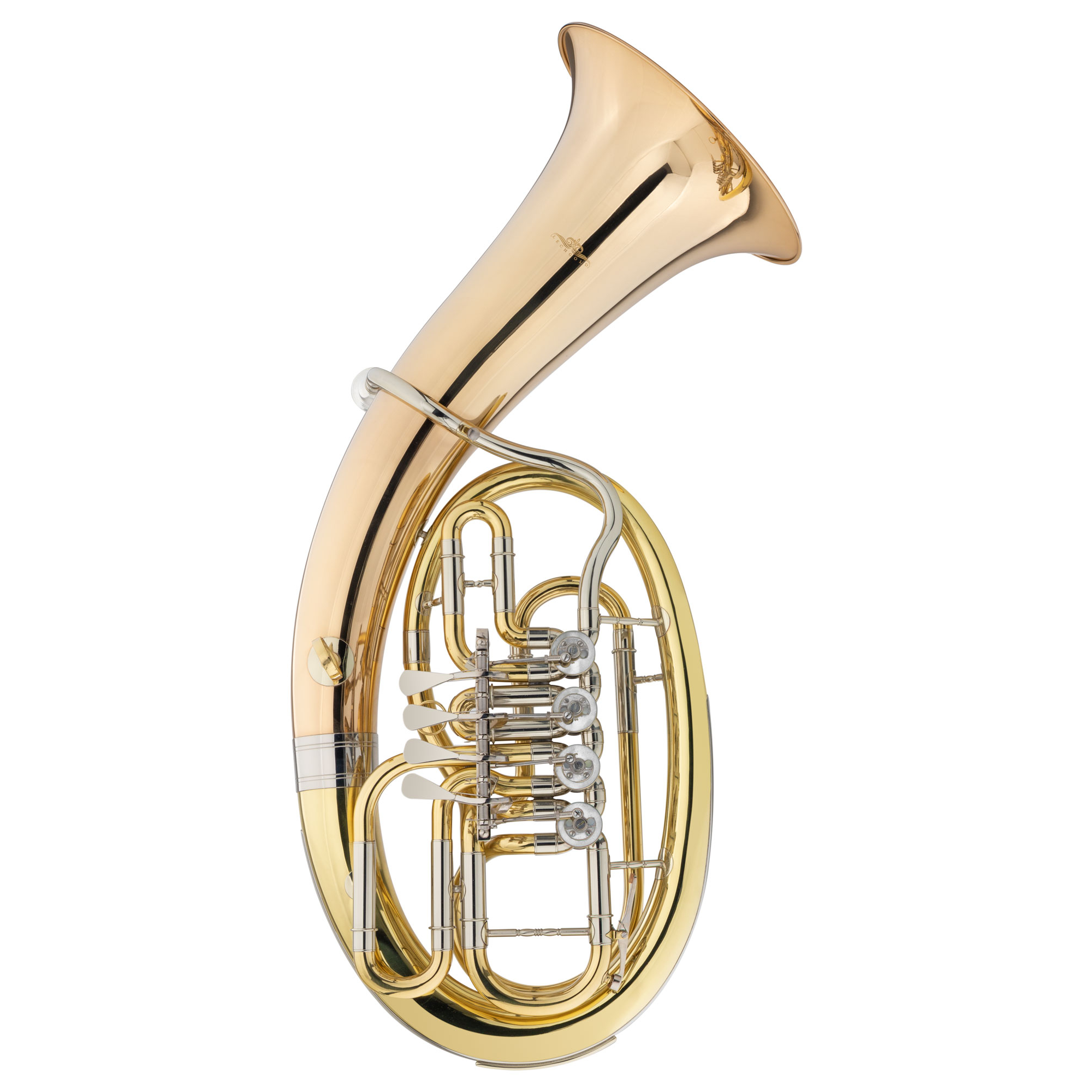 Der Korpus des Baritons ist aus Messing gefertigt. Das Schallstück besteht aus Goldmessing, das Mundrohr aus Neusilber. Die vier in einer Reihe angebrachten Dreh-Ventile sind mit Minibal®-Gelenken ausgestattet. Der Durchmesser des Schallbechers beträgt 26 cm, die Bohrung misst 14,8 mm.