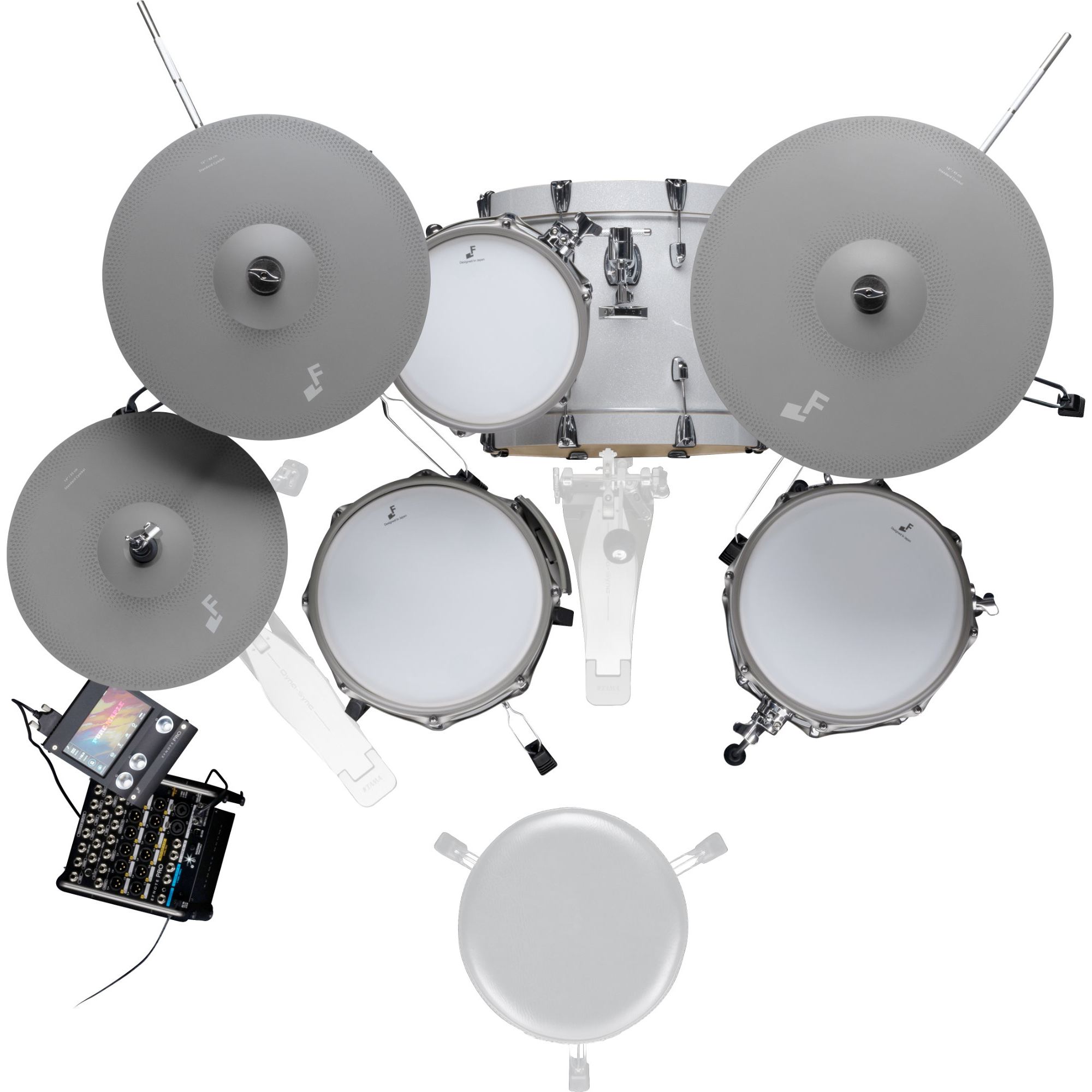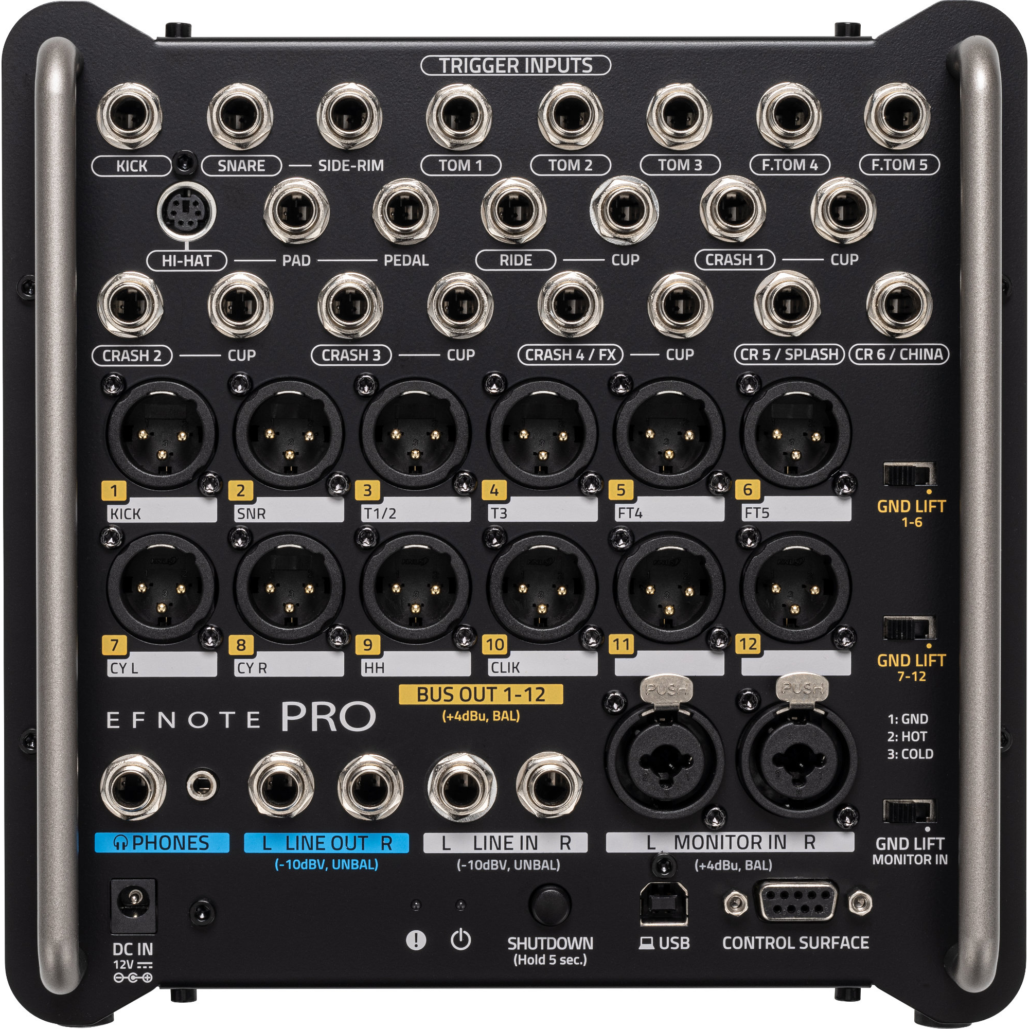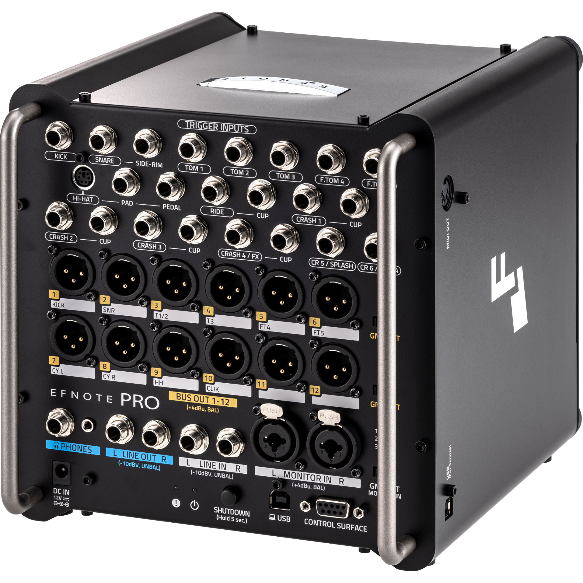 EFNOTE PRO unterstützt 7 Trommeln und 8 Becken. Alle Pads sind individuell verkabelt, so dass sich die Spieler/innen an jede musikalische Umgebung anpassen können. Alle Klangeinstellungen können schnell gespeichert und geladen werden, sodass mehrere Spieler und Set-Listen jederzeit möglich sind. Außerdem können Schlagzeuger, Produzenten oder Mischer dank der 12-Kanal-Multitrack-USB-Audio- und 16-Kanal-USB-MIDI-Schnittstelle schnell auf die Bearbeitung zugreifen, um die Budgetvorgaben der Künstler zu erfüllen.