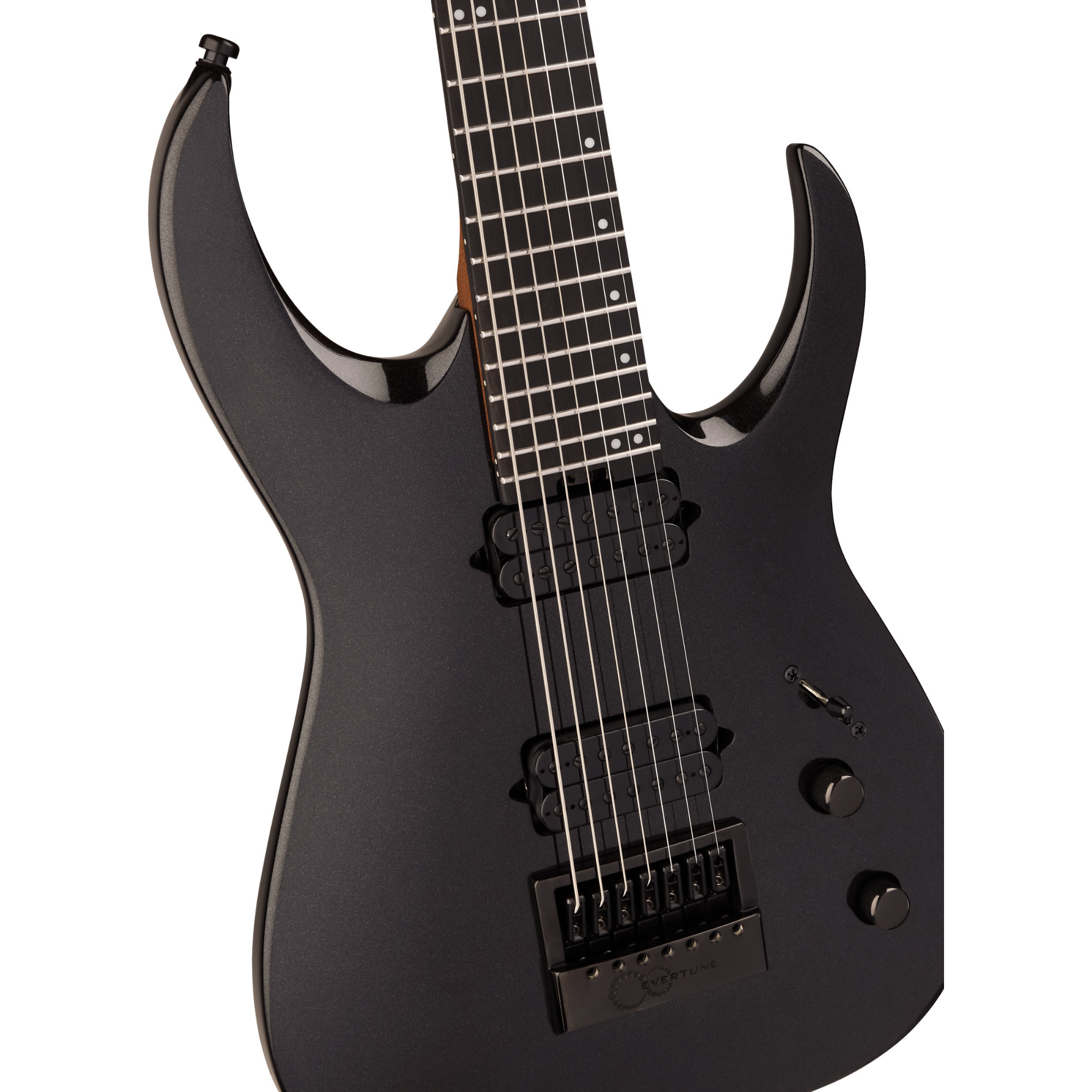 Diese 7-saitige Juggernaut ist wunderschön in Metallic Black mit einer farblich abgestimmten Jackson 4x3 AT-1-Kopfplatte und schwarzer Hardware.