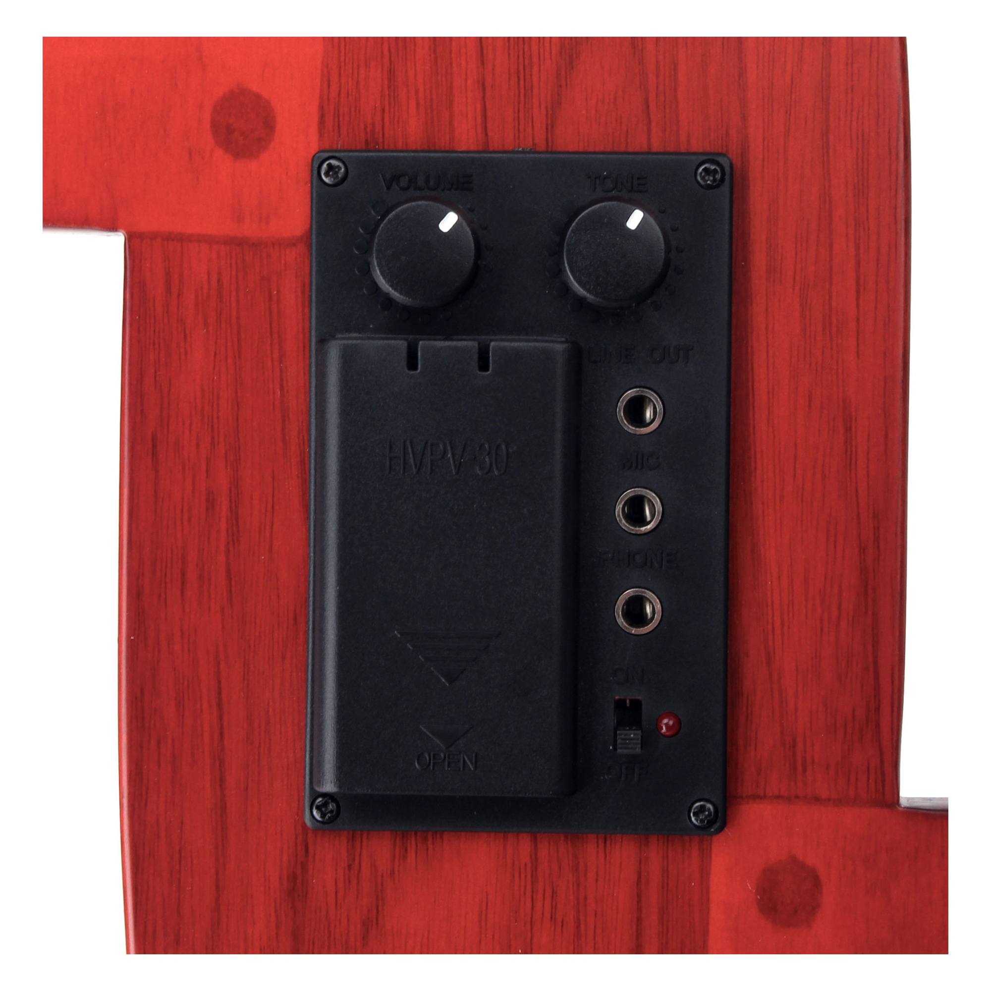 Das CE-200 verfügt über ein Tonabnehmersystem mit Line-Ausgang. Mithilfe des Instrumentenkabels, das im Lieferumfang enthalten ist, können Sie Ihr Cello an jede handelsübliche Anlage, an Verstärker, Effektgeräte und Taschensender anschließen. Neben dem Ein-/Ausschalter und dem Lautstärkeregler steht Ihnen ein Tonregler zur Verfügung, mit dem Sie den Klang nach persönlichem Gusto heller oder weicher einstellen können. Auch eine 9V-Blockbatterie ist im Lieferumfang enthalten.