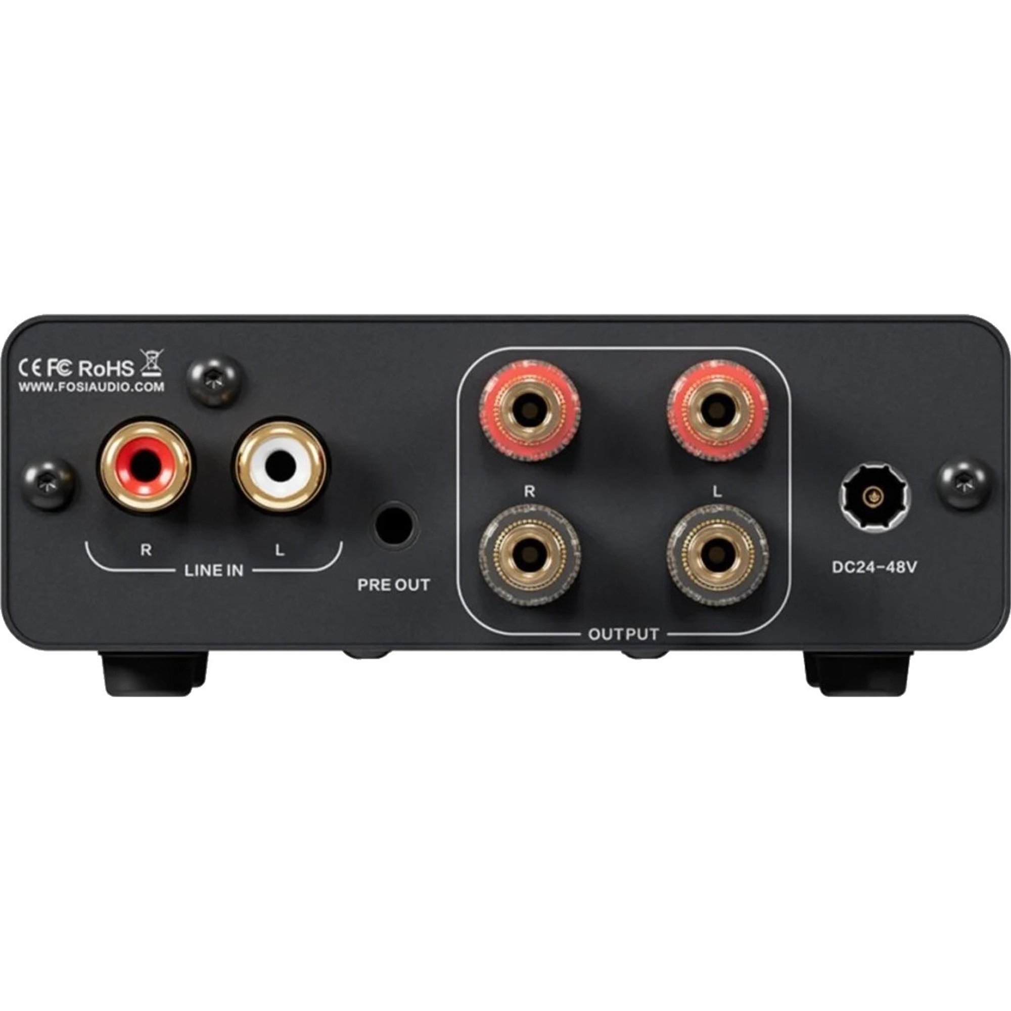 - Ausgänge: Lautsprecherausgang (Bananenstecker, Schraubanschlüsse), Pre Out
