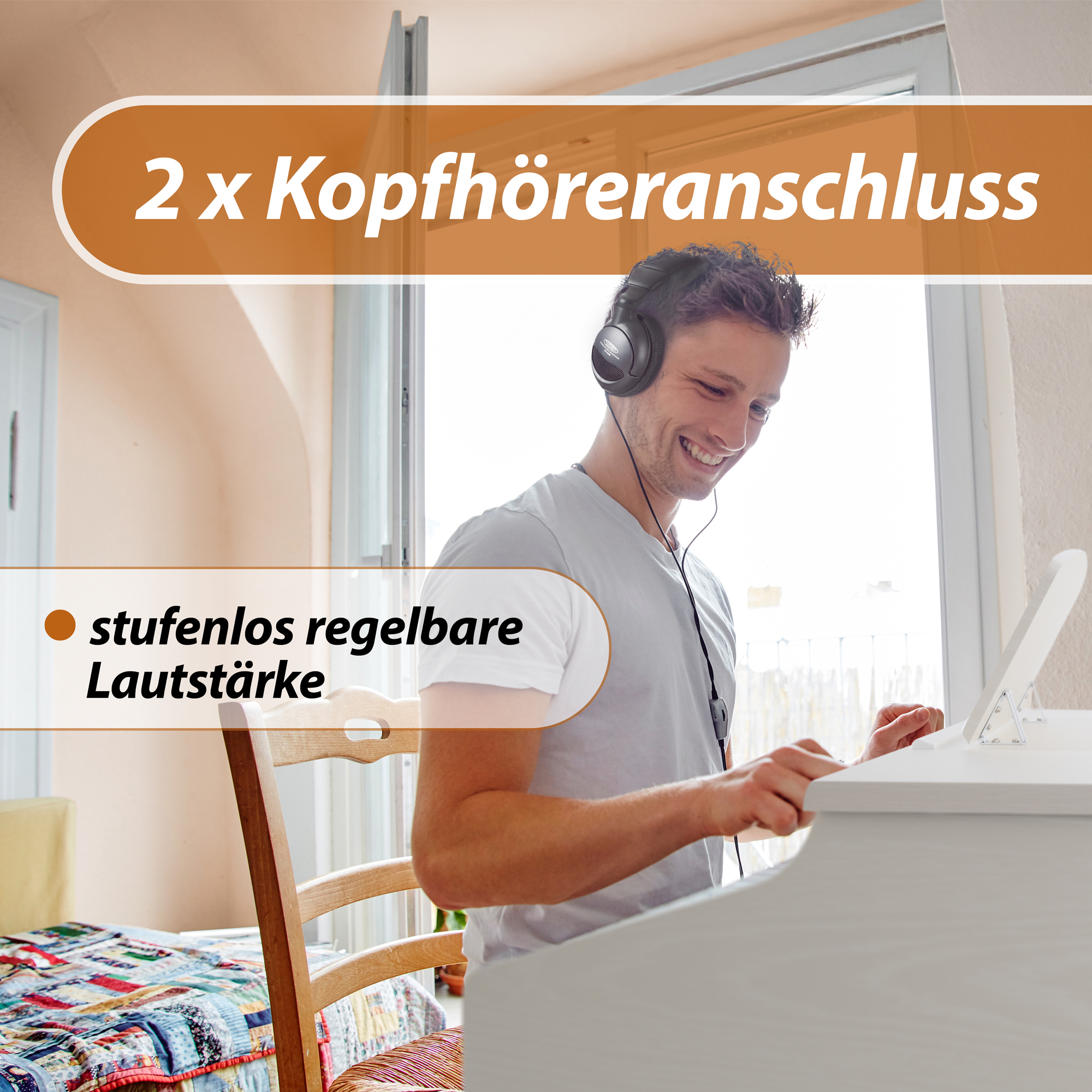 - Stufenlose Lautstärkeregelung (Drehknopf)