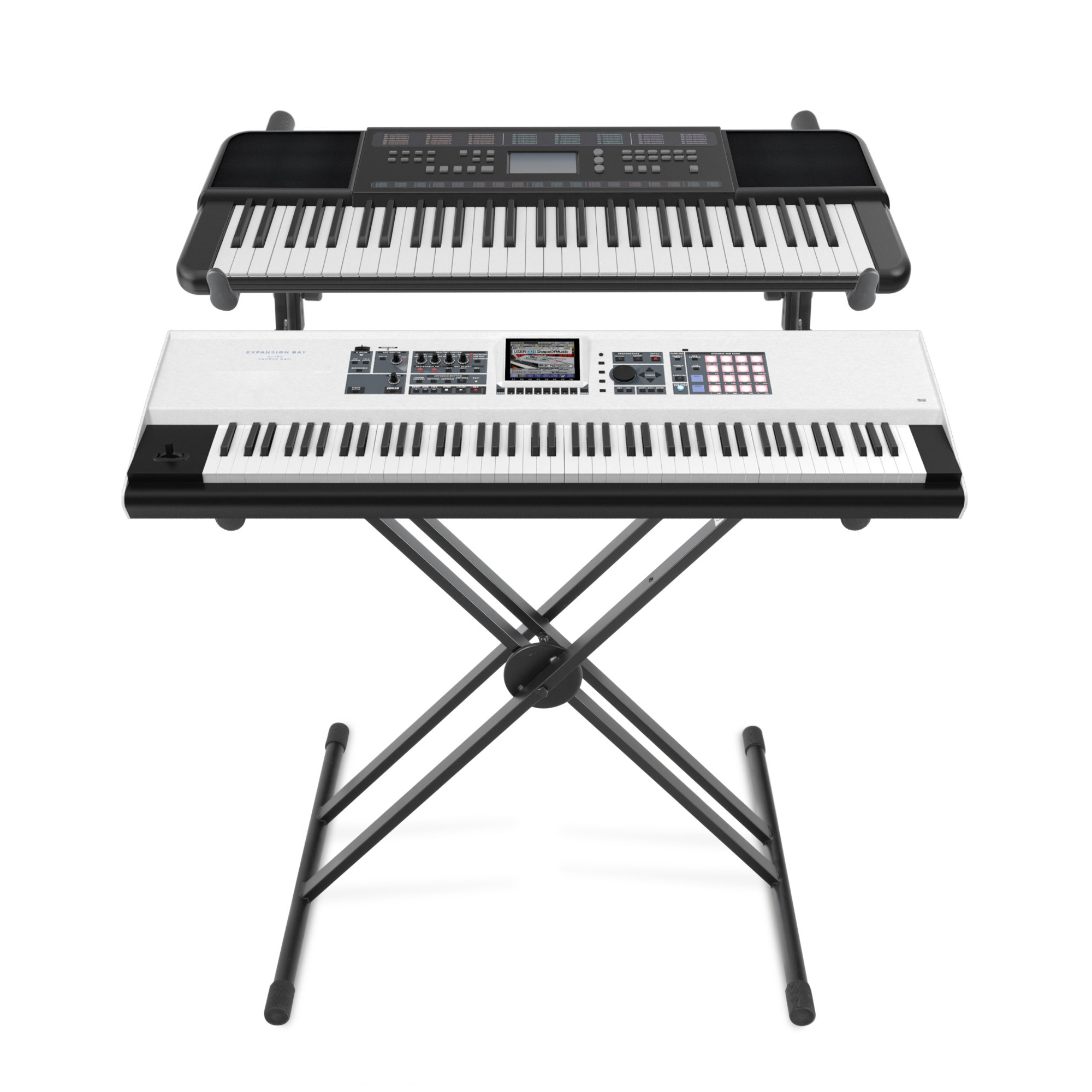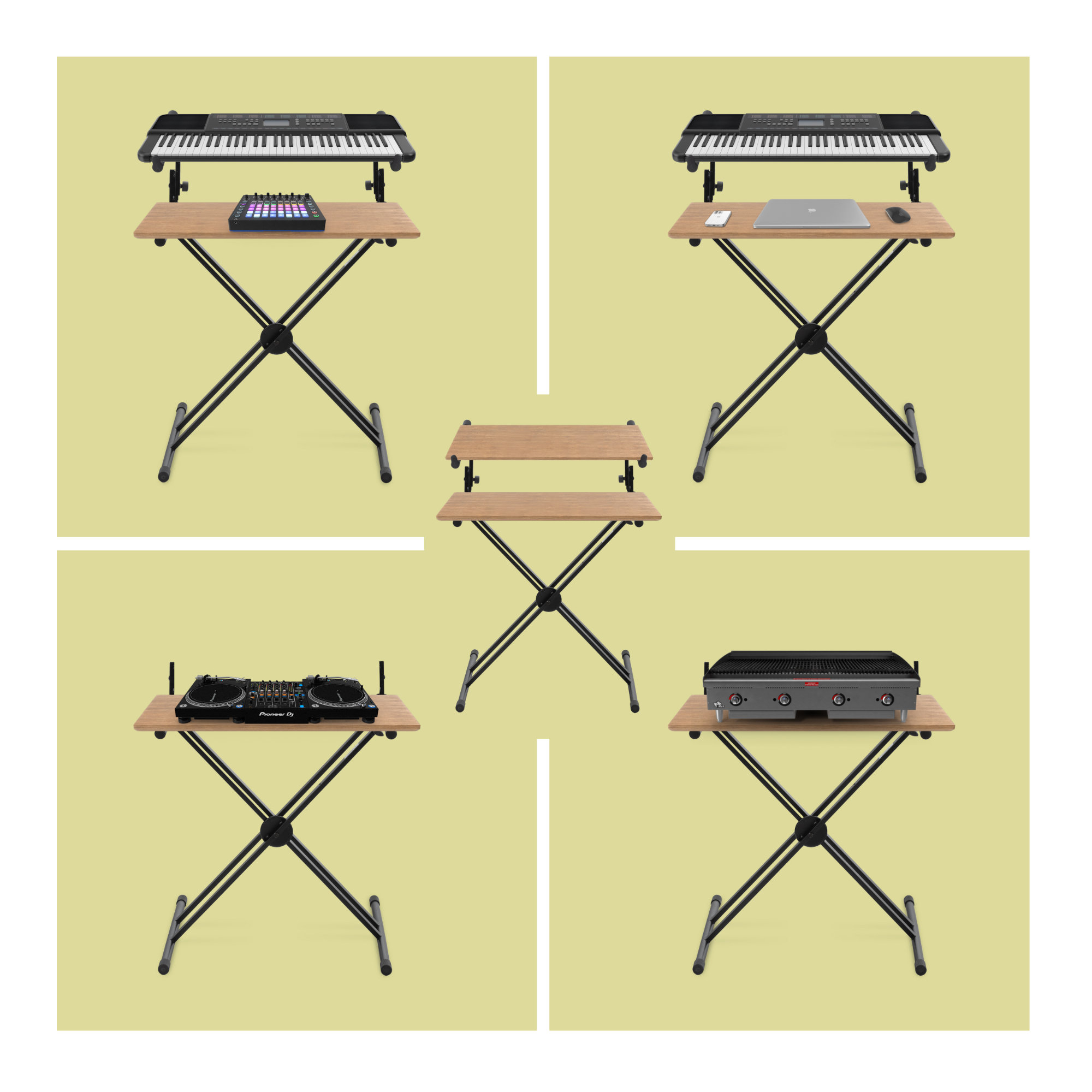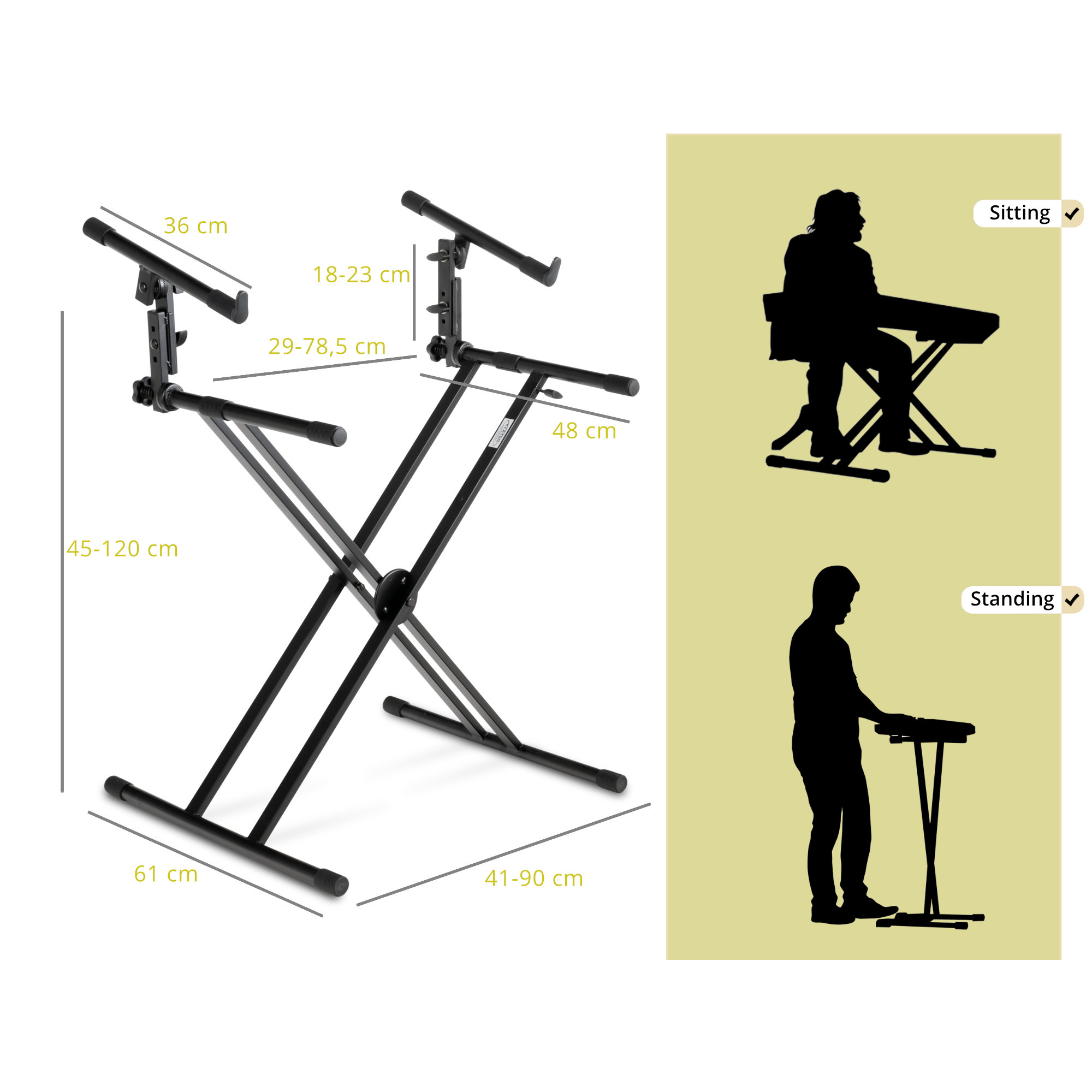 Dieser sehr stabile, doppelstrebige Keyboardständer mit zweiter Ebene bietet sicheren Halt für alle handelsüblichen Stagepianos, Masterkeyboards, portable Keyboards und Synthesizer.