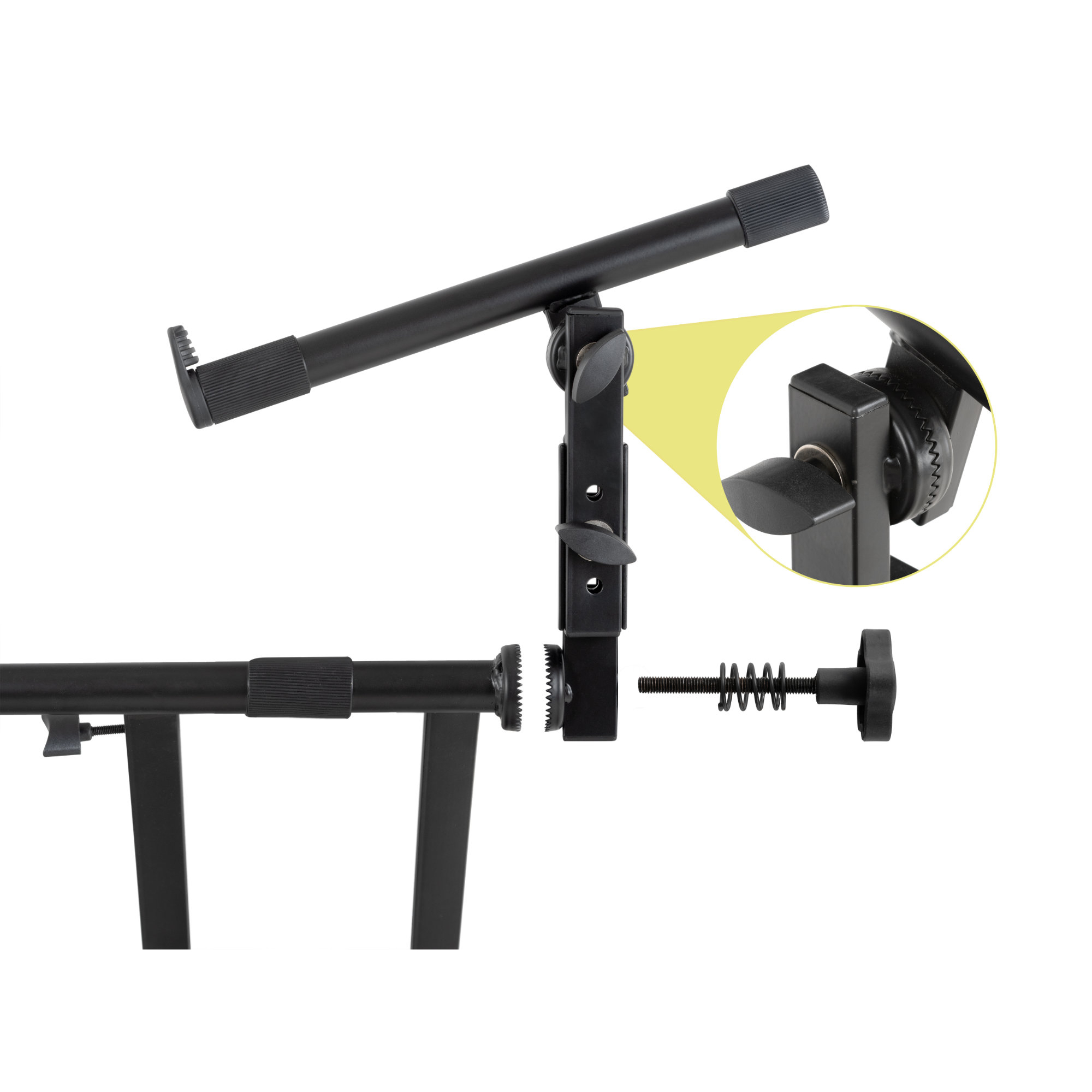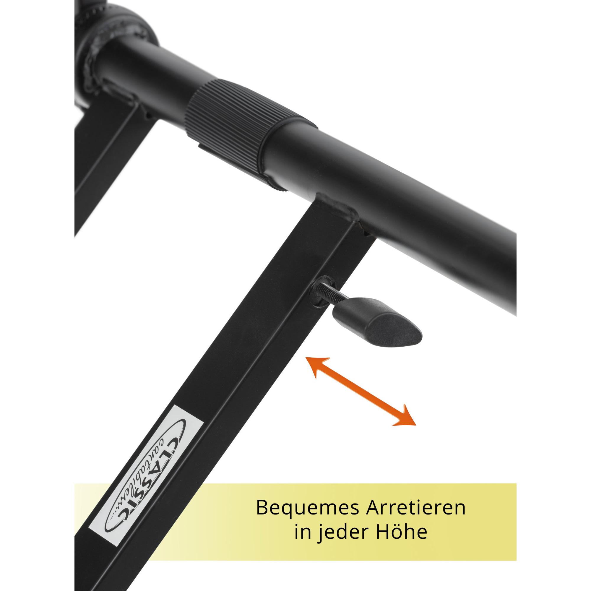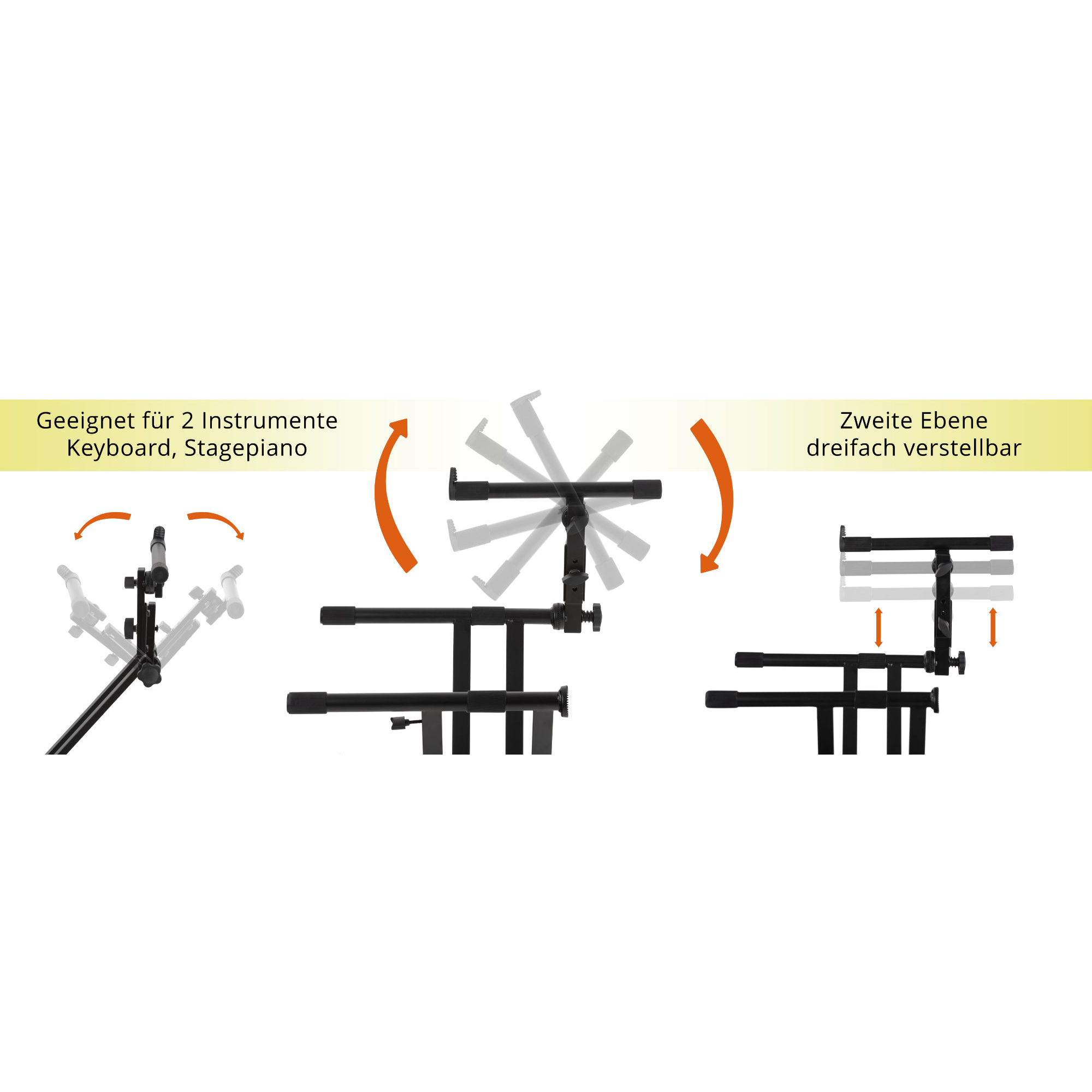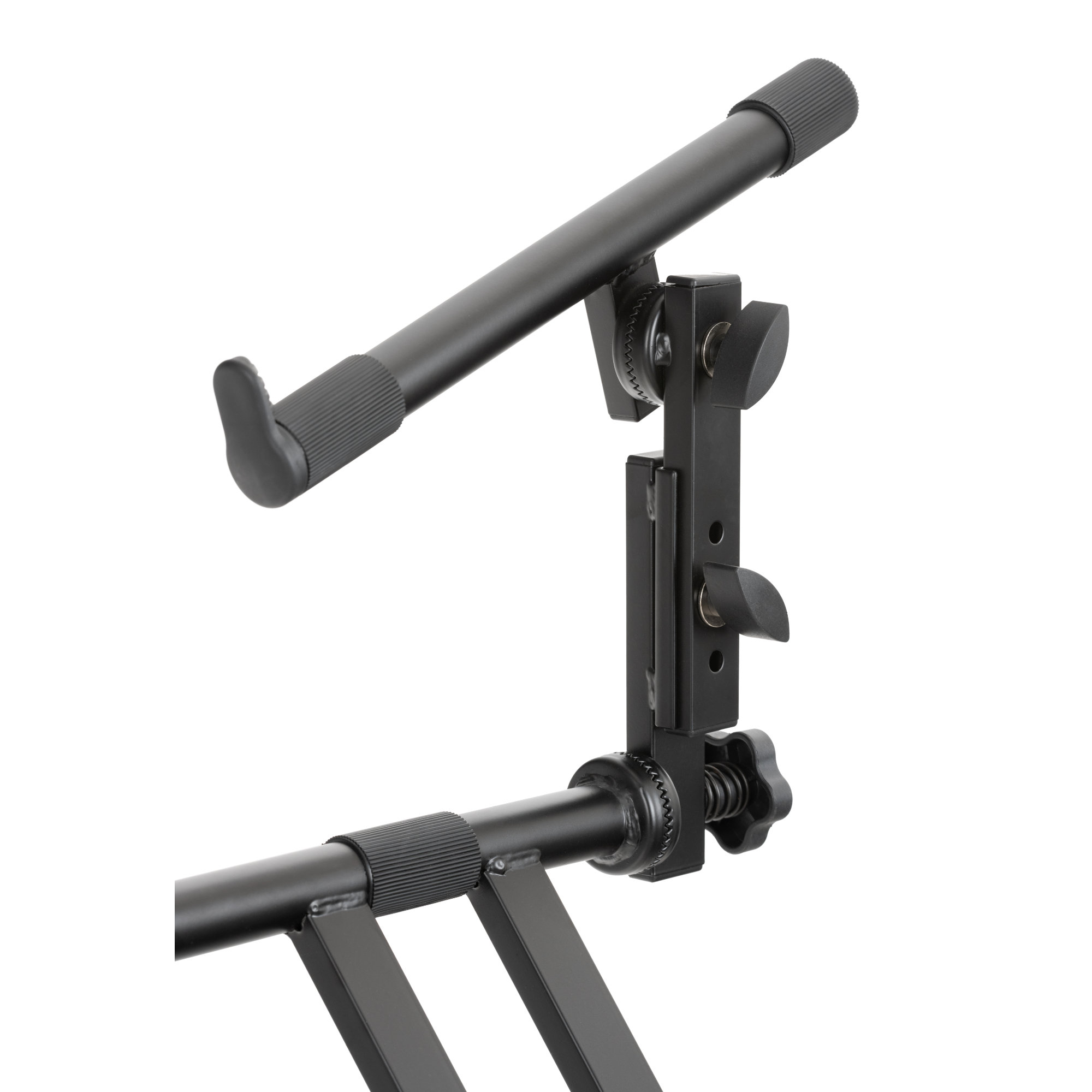 Die erste Ebene des Doppel-X-Ständers kann durch den praktischen Schnellverschluss komfortabel per Tastendruck verstellt werden (siehe unten). Die zweite Ebene lässt sich stufenlos verstellen, da die Gelenke über bewährte und robuste Zahnsegmentverschlüsse verfügen. Zusätzlich kann die zweite Ebene sowohl vertikal als auch horizontal geneigt und die Höhe dreifach justiert werden, ebenfalls ganz bequem ohne Werkzeug. Selbstverständlich kann der Aufsatz für das zweite Keyboard auch abgenommen und der Ständer somit als Einzel-Keyboardständer verwendet werden.