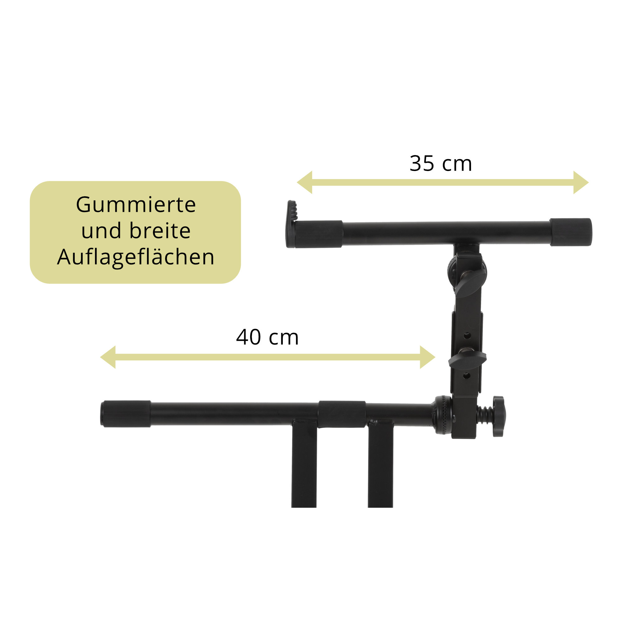 Das Doppelkreuz ist aus solidem 4-Kantstahl gefertigt für optimale Belastbarkeit. Alle Rohrenden sind mit geriffelten Gummimanschetten ausgestattet - für rutschfesten und kratzfreien Stand. Die Gummiauflagen der beiden Ebenen lassen sich zusätzlich in ihrer Position variieren, um sie auf verschiedenste Instrumententypen und -größen anpassen zu können. Des Weiteren verfügt die obere Ebene über eine vorderseitige Abrutschsicherung - auch bei starker Schräglage liegt Dein Instrument sicher auf dem Ständer.