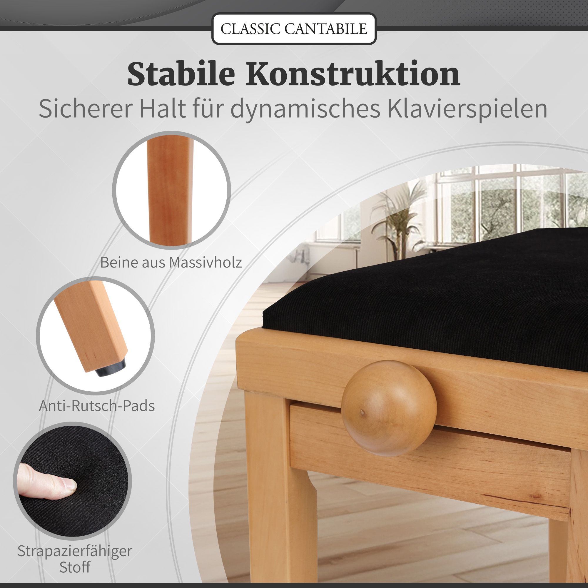 Classic Cantabile Pianobänke bieten neben ihrer hochwertigen Optik hochwertige Ausstattungmerkmale wie stabile, mit rutschfestem Gummi versehene Beine, eine leichtgängige, präzise Spindelmechanik zur Höhenverstellung und eine strapazierfähige, mit 55 x 32 cm bequeme extragroße Sitzfläche mit einem pflegeleichten Kordbezug. Bei Bedarf lässt sich das Polster einfach herausnehmen. Die Vollholzkonstruktion sorgt für stabilen Stand und eine Belastbarkeit von bis zu 120kg.