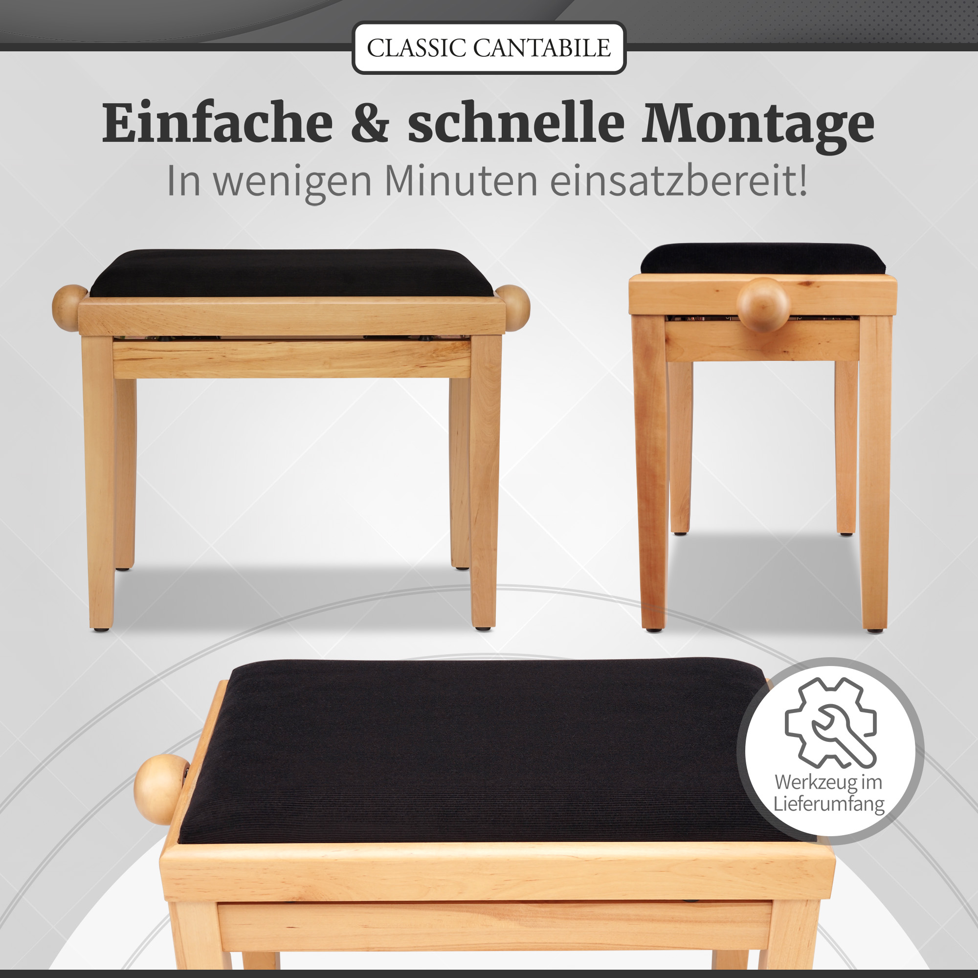 Unsere Classic Cantabile Pianobänke lassen sich auch von Laien in wenigen Minuten montieren. Das benötigte Werkzeug ist bereits im Lieferumfang enthalten.