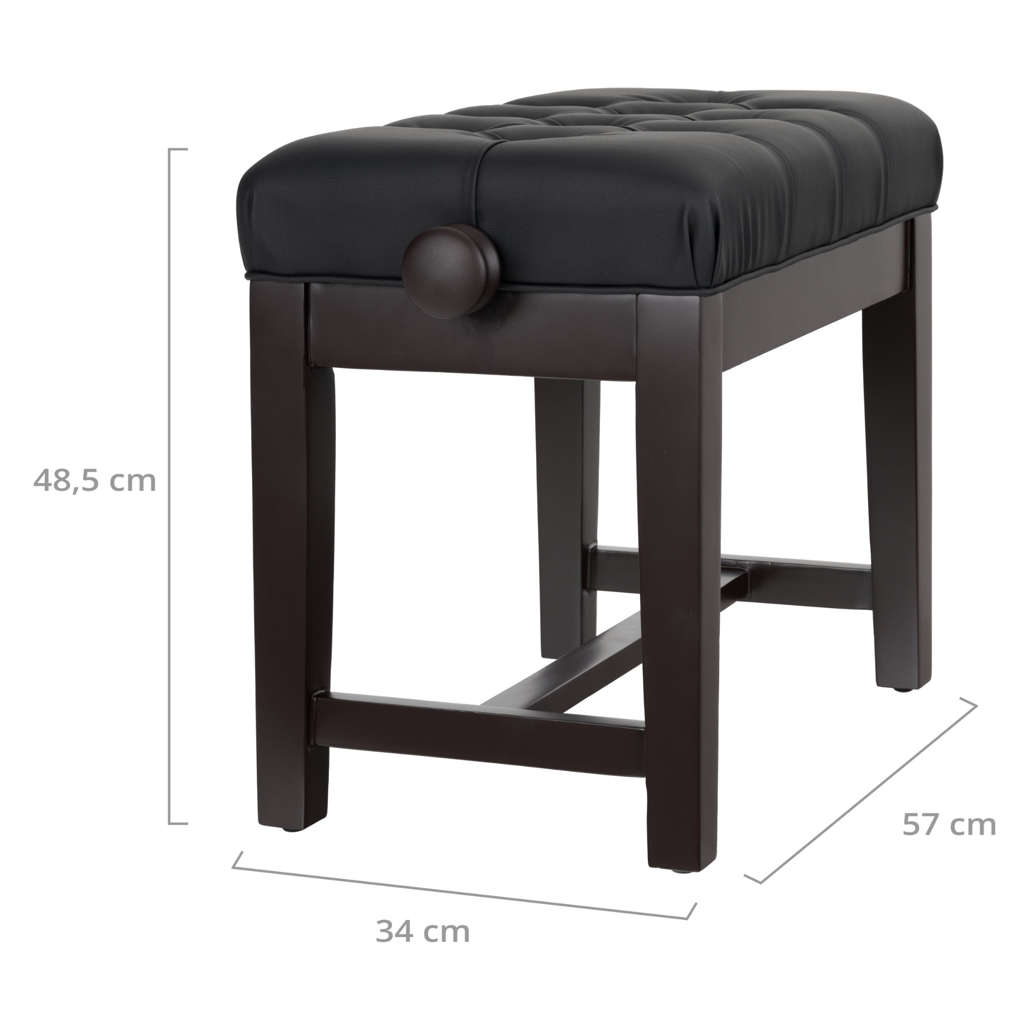 Der Rahmen dieser Bank ist fest mit den Beinen verleimt, wodurch eine sehr hohe Stabilität bis zu einer Belastung von 200 kg gewährleistet wird. Die Streben an der Unterseite schaffen hier zusätzliche Sicherheit. Ihre edle Optik erhält die Pianobank weiterhin durch eine aufwendig vernähte Sitzfläche, welche mit Kapitonierungen versehen ist. Als spezielles Feature sind die Gummifüße an der Unterseite mit einem Gewinde versehen, dadurch schützen sie nicht nur vor Kratzern im Fußboden, sondern können auch Bodenunebenheiten ausgleichen.