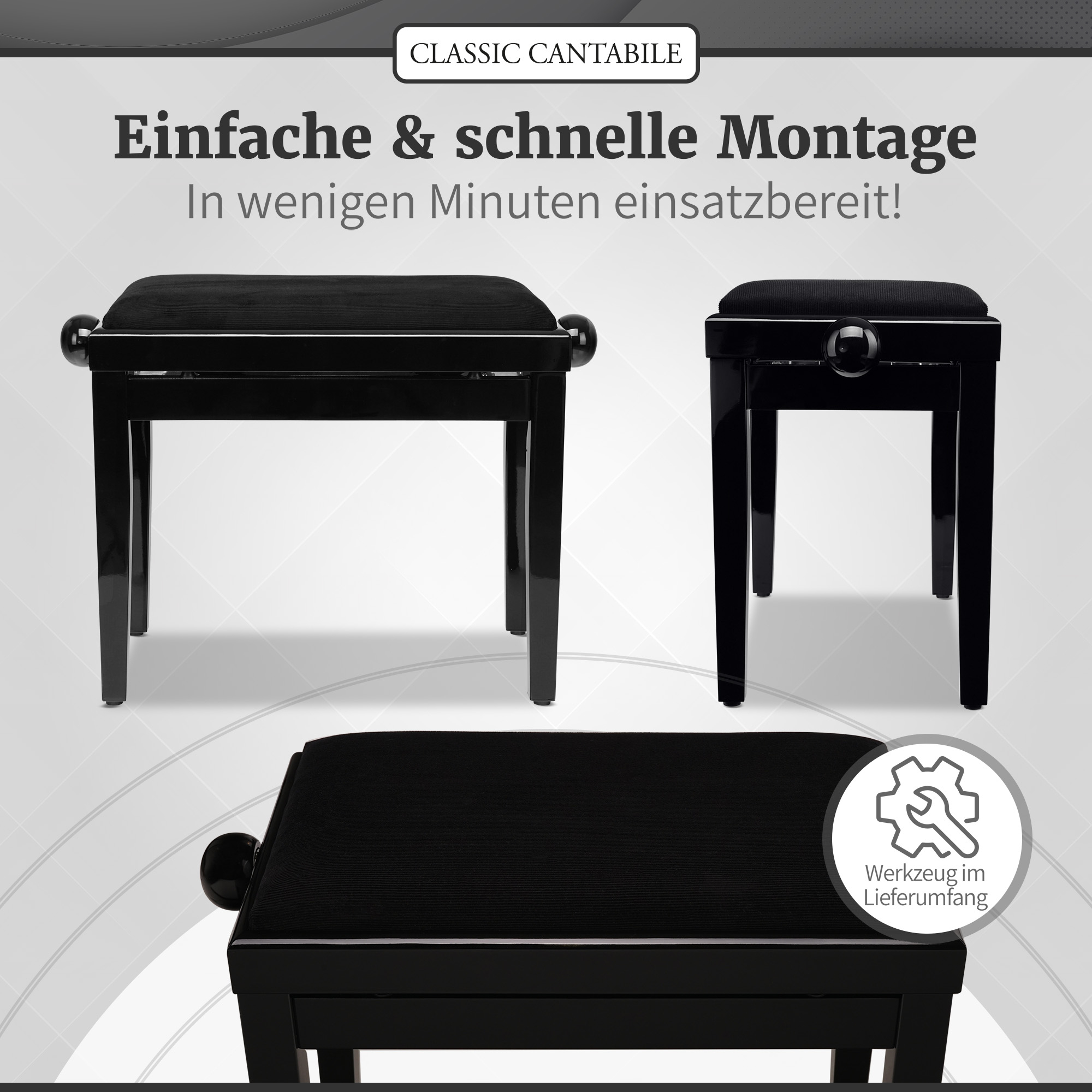 Unsere Classic Cantabile Pianobänke lassen sich auch von Laien in wenigen Minuten montieren. Das benötigte Werkzeug ist bereits im Lieferumfang enthalten.