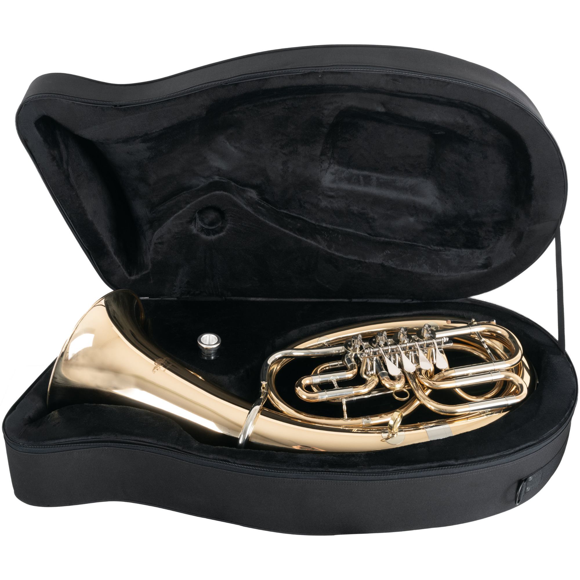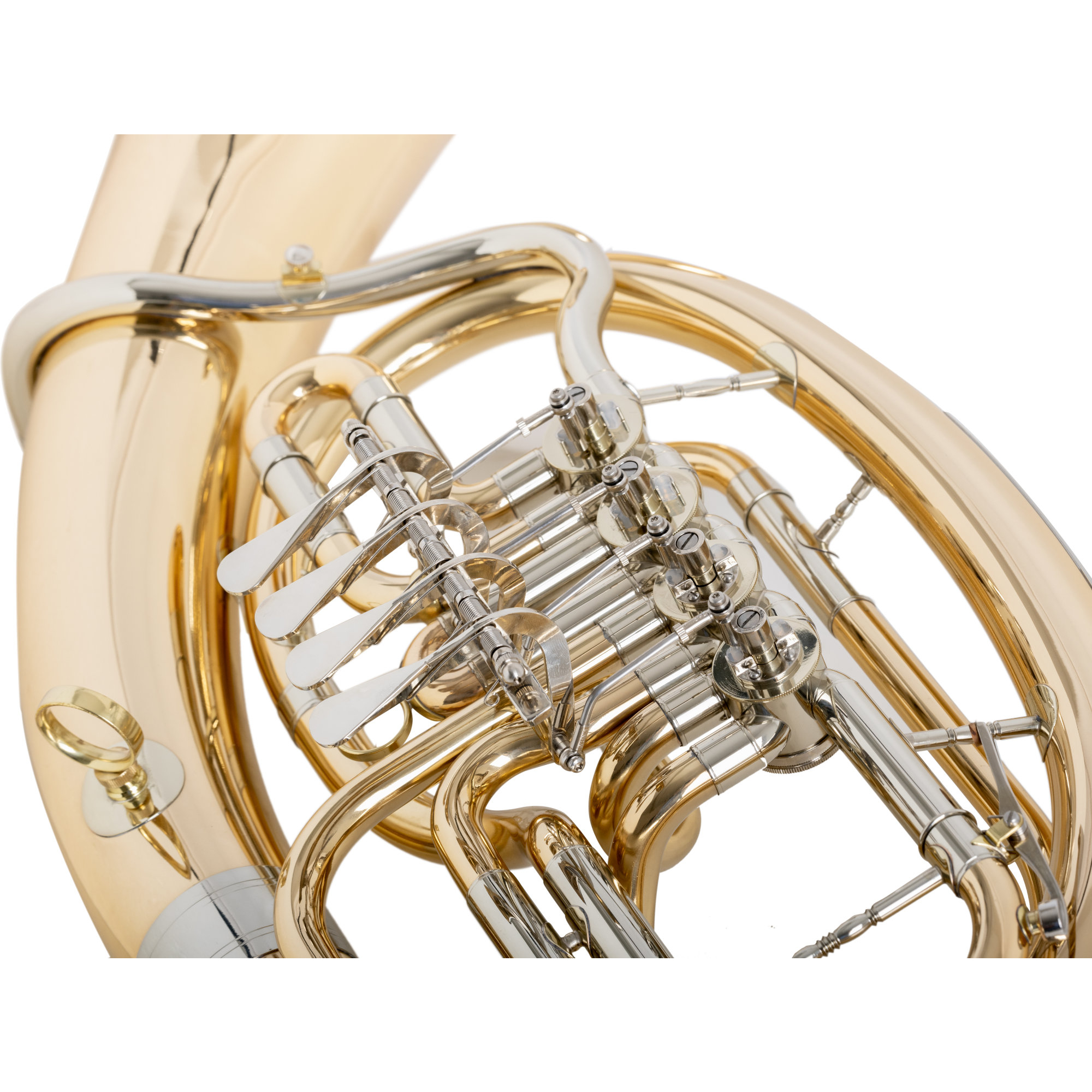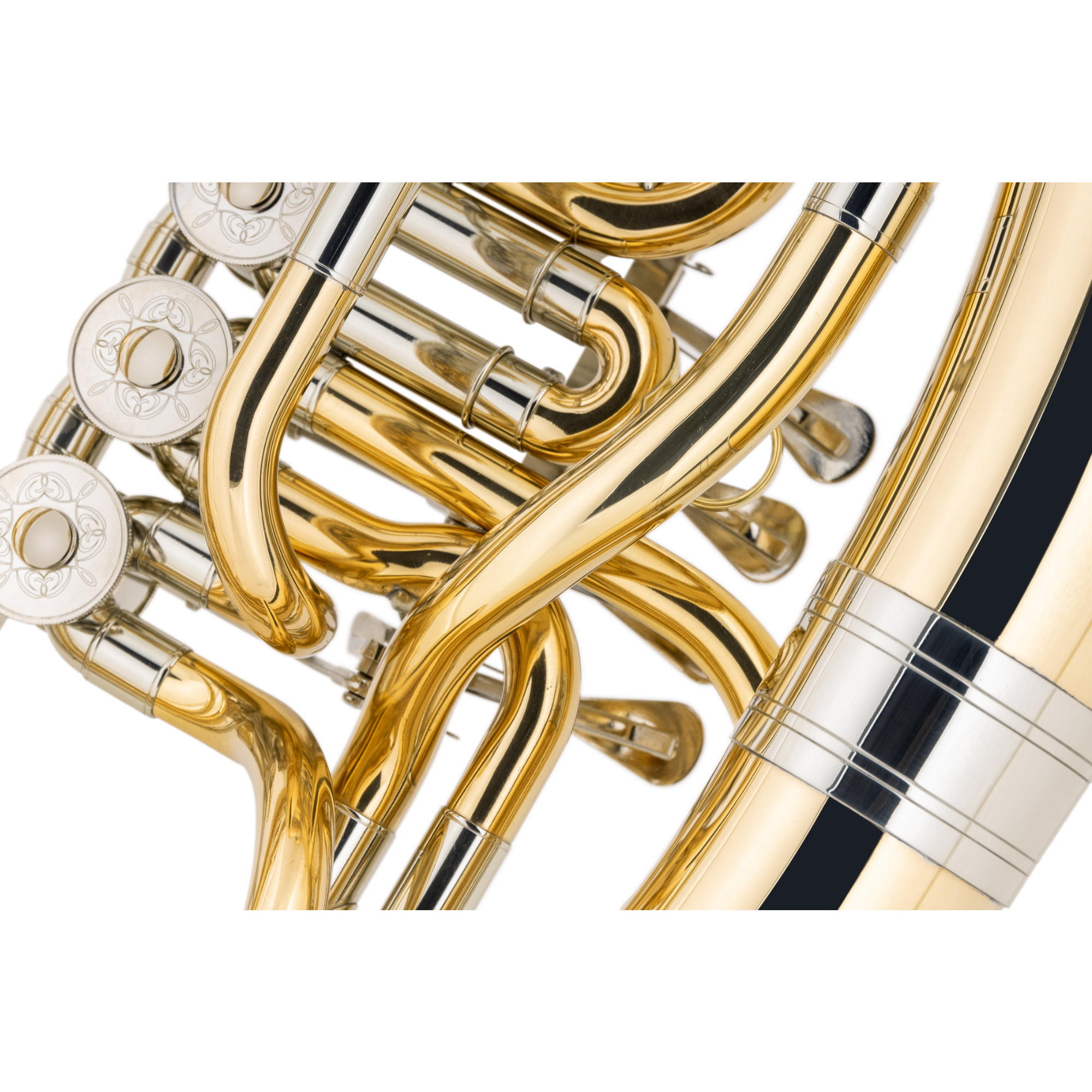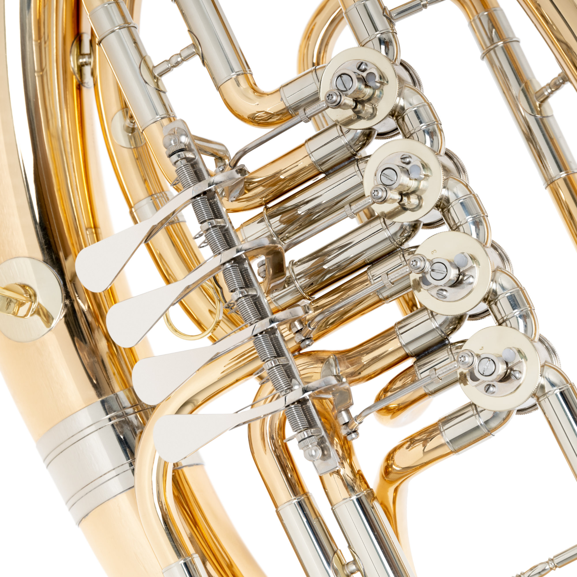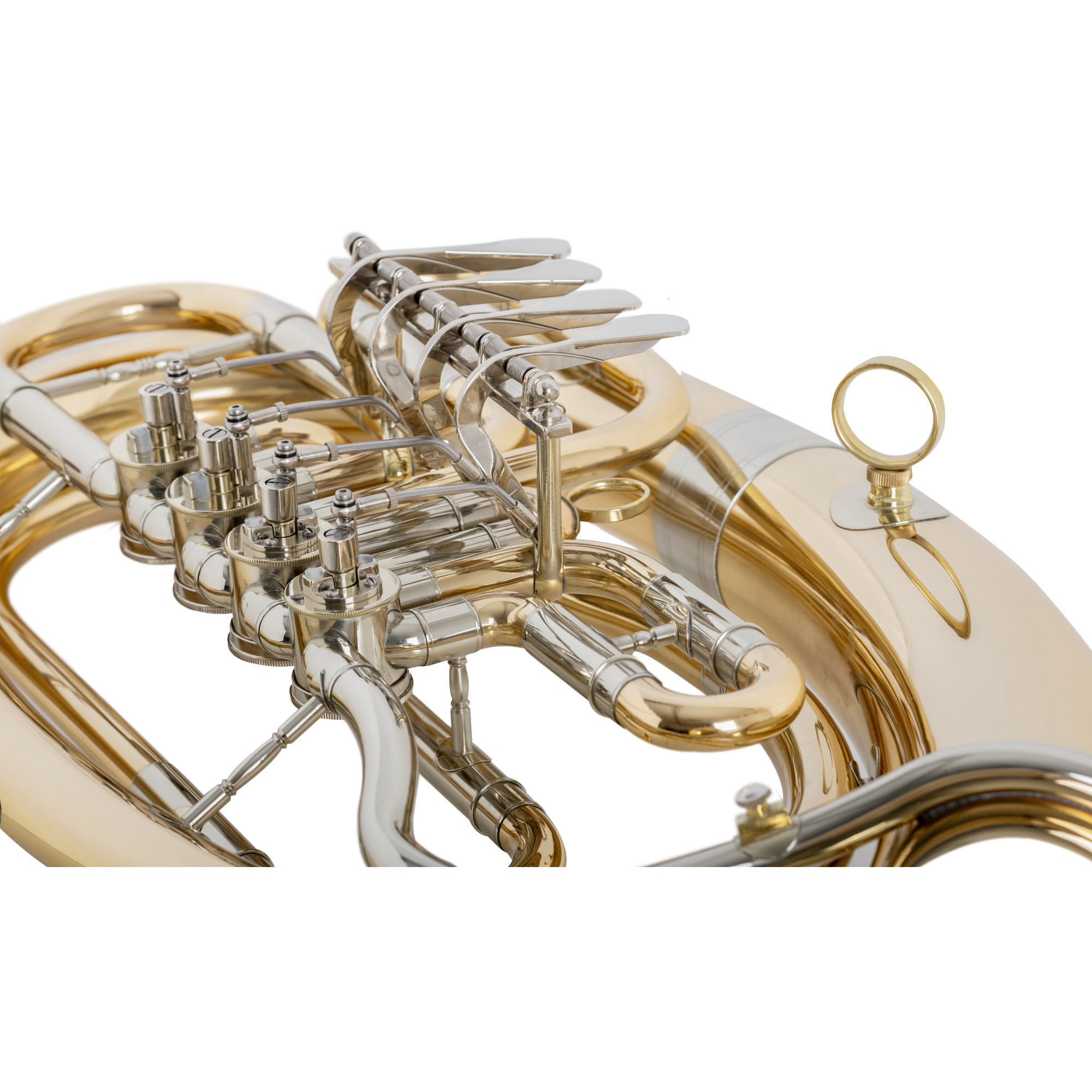 Der Korpus und das Schallstück des Baritons sind aus Goldmessing gefertigt, das Mundrohr aus Neusilber. Die Maschine ist mit Minibal-Gelenken ausgestattet und garantiert dadurch einen perfekten und zuverlässigen Lauf der Ventile. Der Durchmesser des Schallbechers beträgt 26 cm, die Bohrung misst 14,8 mm. Geliefert wird das Bariton natürlich im robusten Hartschalenkoffer und inklusive versilbertem Mundstück.
