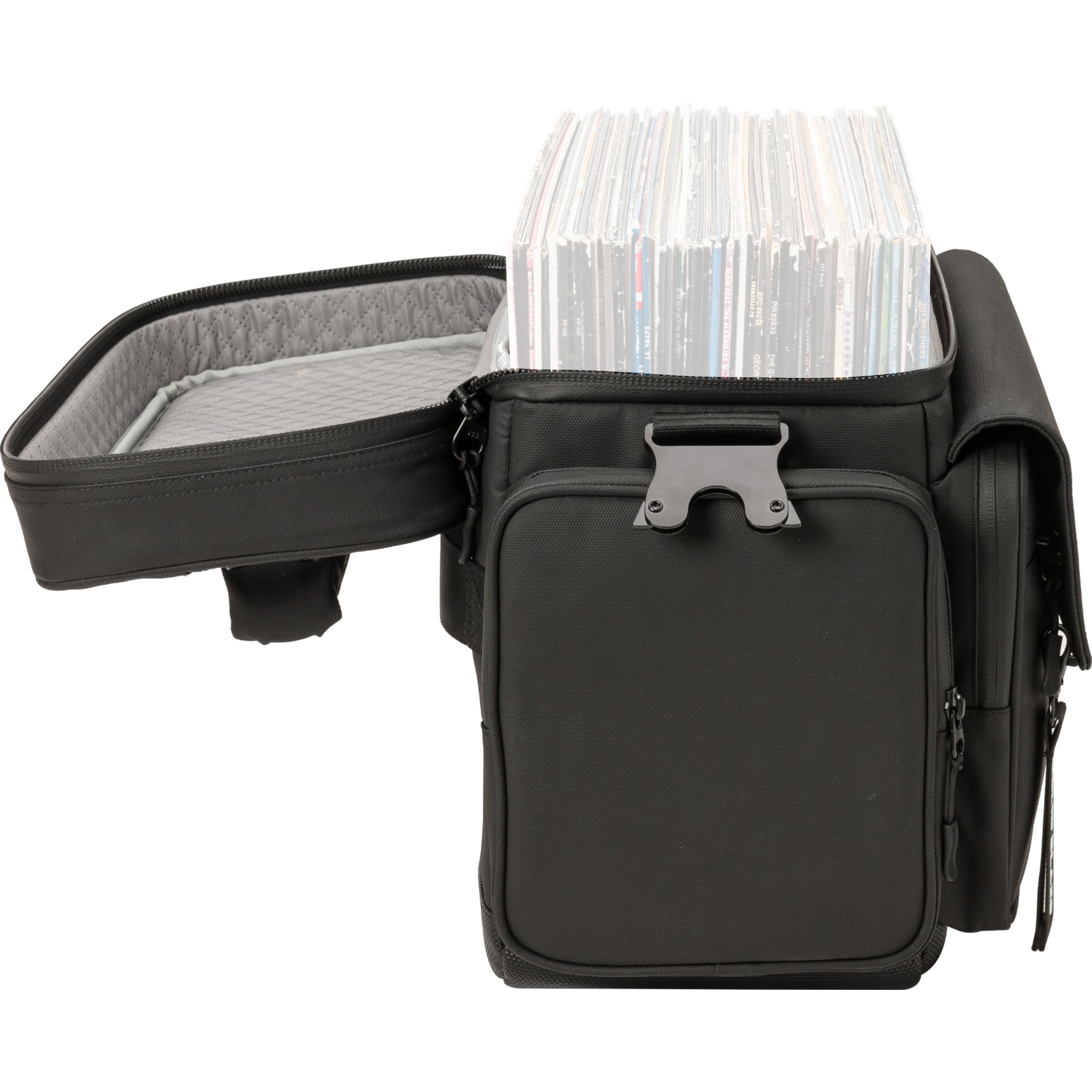 - Draagtasje voor 50x 12"-vinyls, 10 x 7"-vinyls (voorvak) & koptelefoons