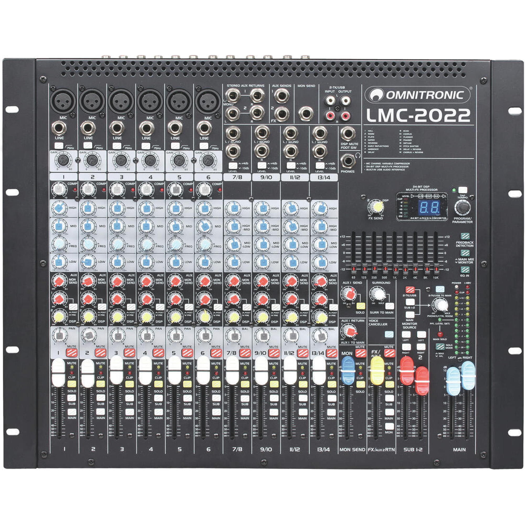 Met het model LMC-2022FX USB uit de LMC-serie krijg je een compact mengpaneel dat ondanks het geringe formaat overtuigt met professionele uitrusting: zes mono-kanalen, vier stereo-kanalen, ruisarme microfoon-preamps met een dynamisch bereik tot 130 dB, klassieke British-stijl EQ, One-Knob-compressors, een krachtig 24-Bit-DSP met 16 bewerkbare effecten en een geïntegreerd USB-audio-interface vormen een veelzijdige basis voor live-toepassingen en studiowerk.