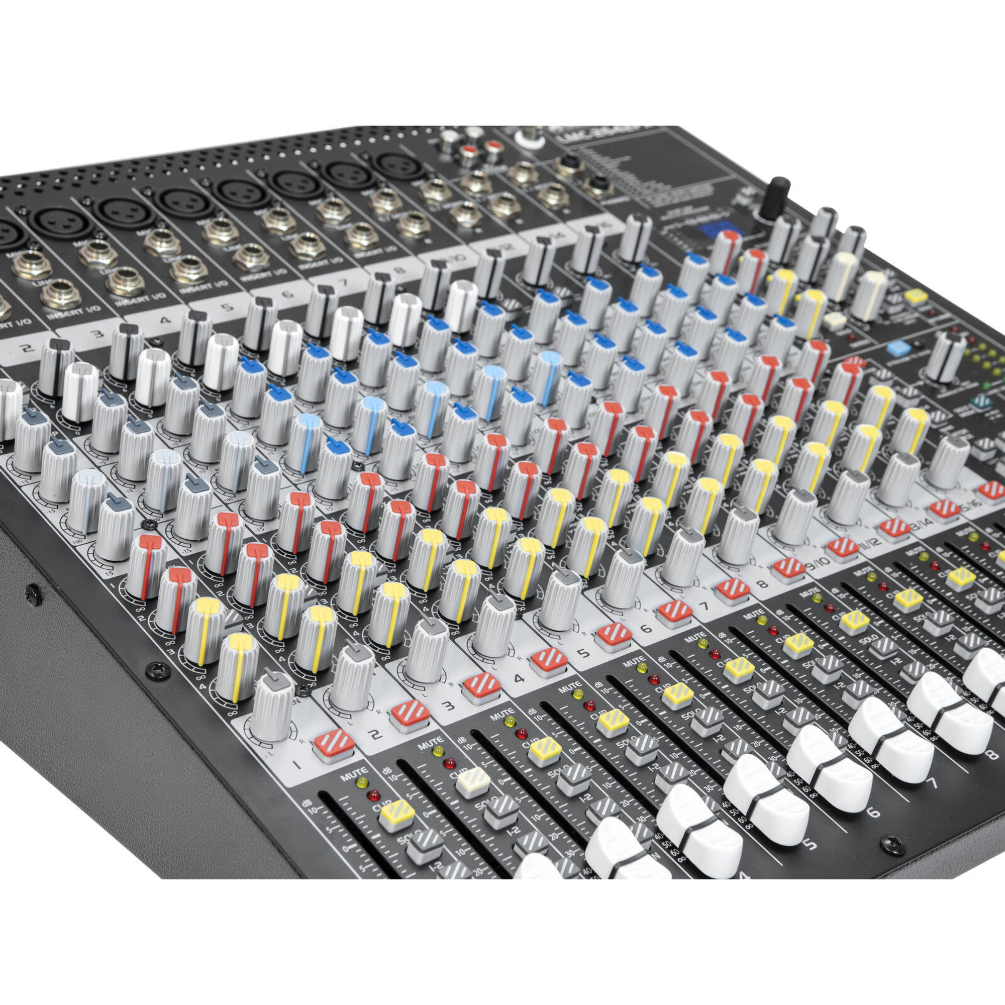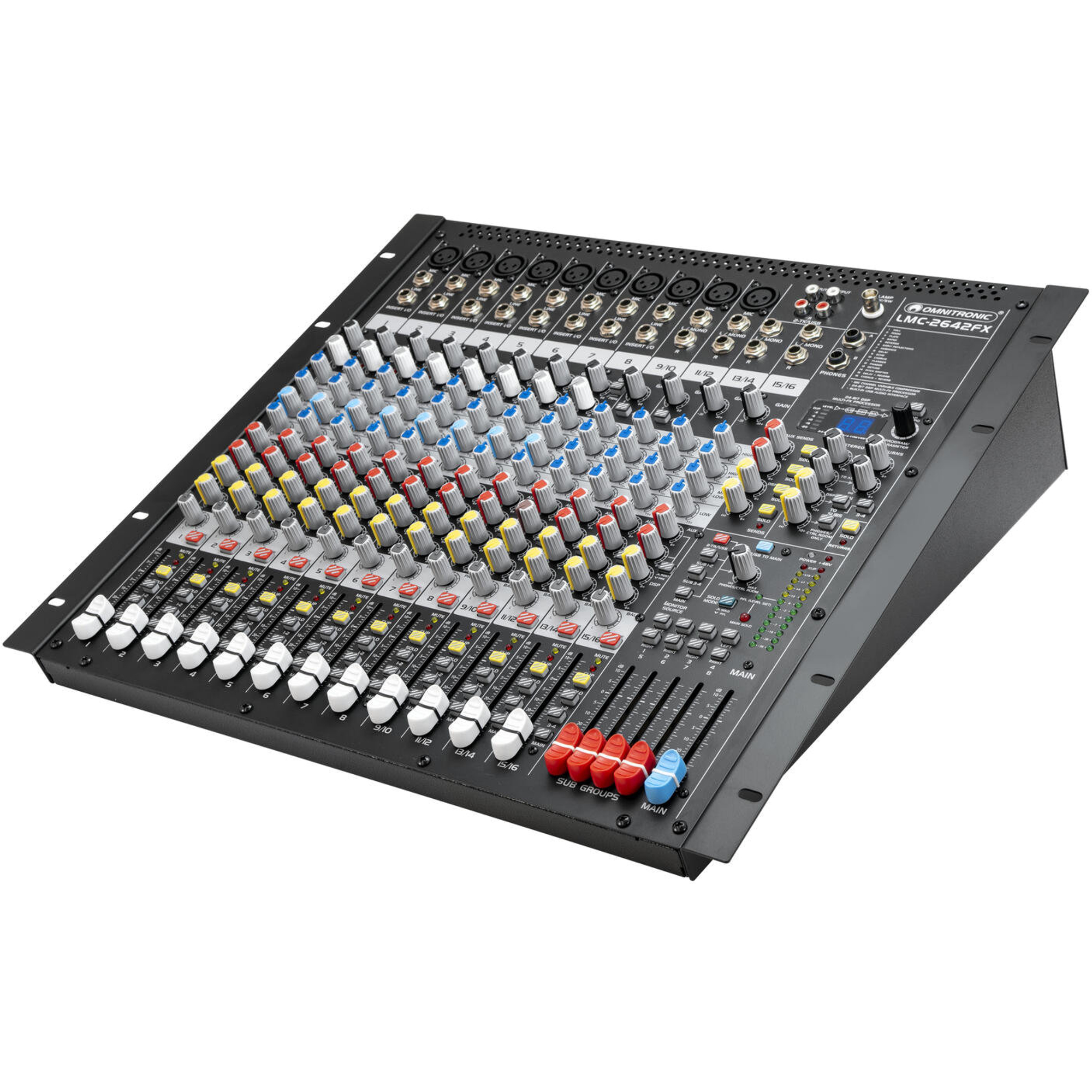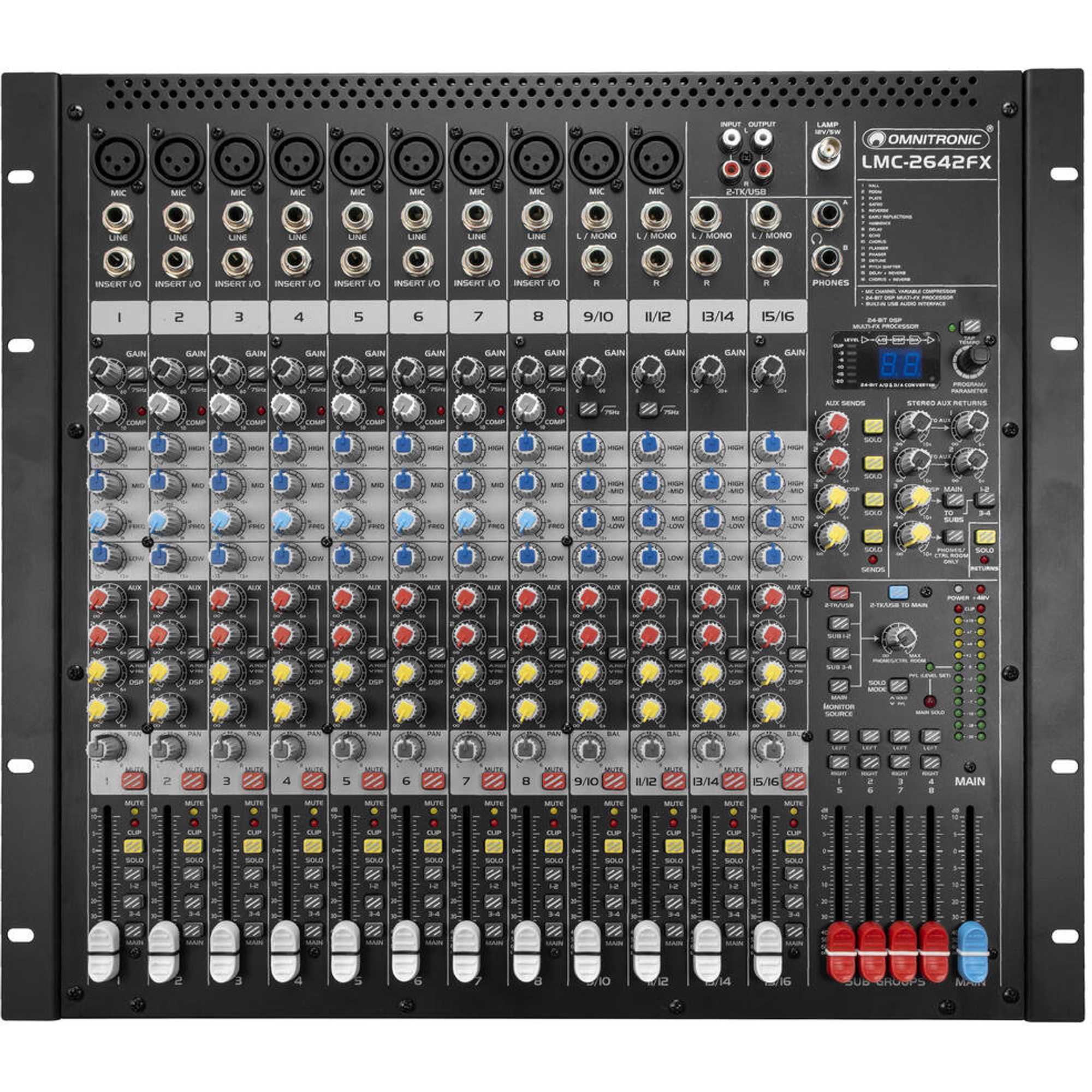 Het model LMC-2642FX USB bundelt alle sterke punten van de LMC-serie in een compact en technisch hoogwaardig apparaat. Of het nu als hoofd-mixer in een liveclub, als veelzijdig schakelpunt in de studio of voor installaties met directe opnameoptie is - hier krijg je een uitstekende uitrusting, slim routing en een klankkwaliteit van hoog niveau.