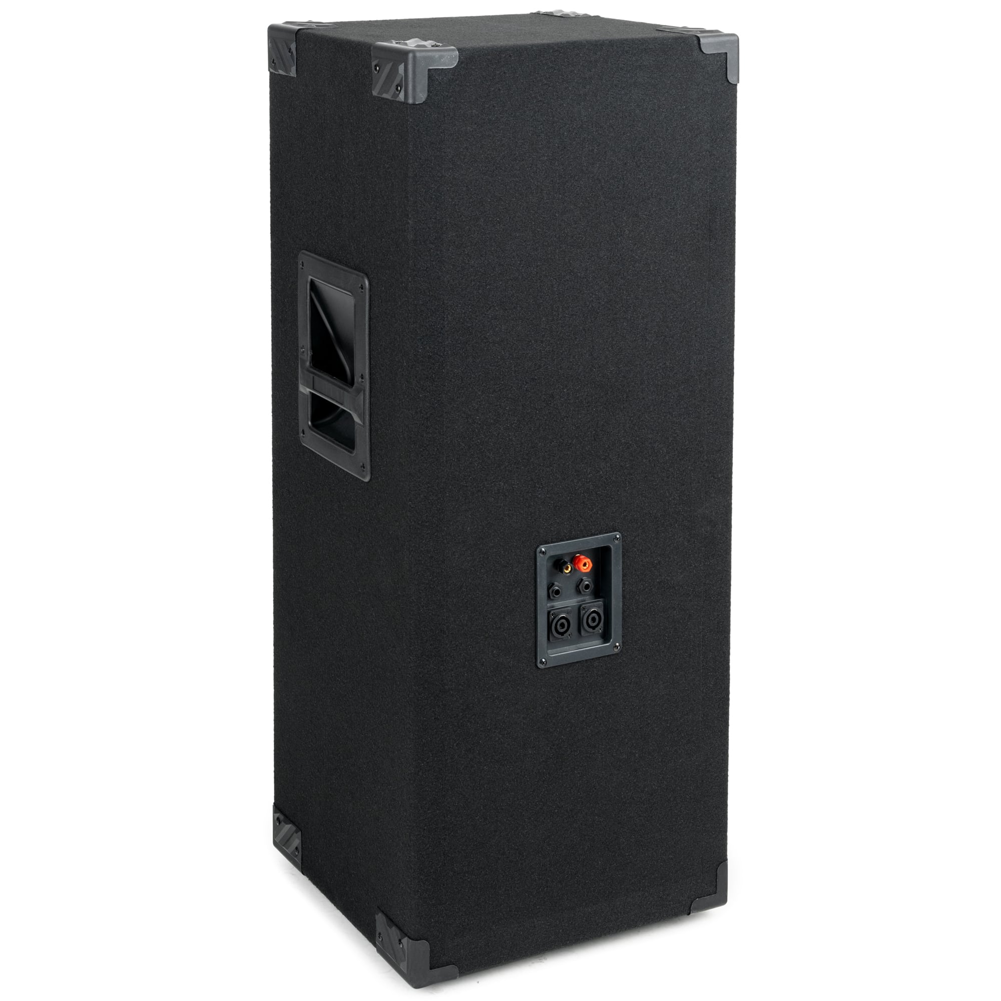 Ein 15" Woofer mit zwei Bassreflex-Rohren sorgt für ordentlich Wums in der Bude. Im Hochtonbereich liefern drei Piezos messerscharfe, knackige Sounds. Die Anschlüsse sind als Klemmen und Klinke ausgeführt um größtmögliche Flexibilität zu gewährleisten. Somit können die Boxen sowohl an eine PA-Endstufe als auch an einen Hifi-Verstärker angeschlossen werden.