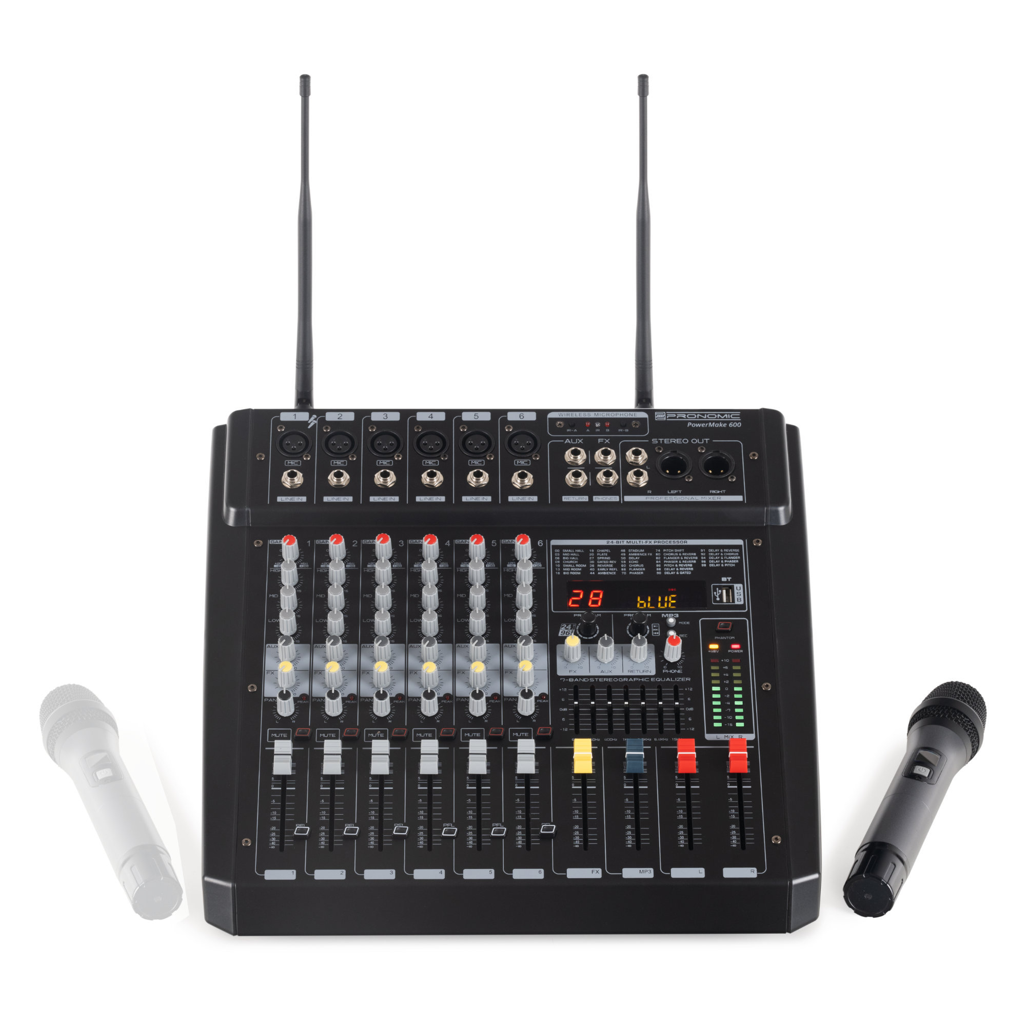 Insgesamt 100 digitale Effekte stehen zur Verfügung, um für den perfekten Klang zu sorgen. Jeweils einer davon kann ausgewählt und jedem Kanal individuell hinzugemischt werden. Für die Anpassung an die Raumakustik steht ein übersichtlicher, grafischer Equalizer zur Verfügung.