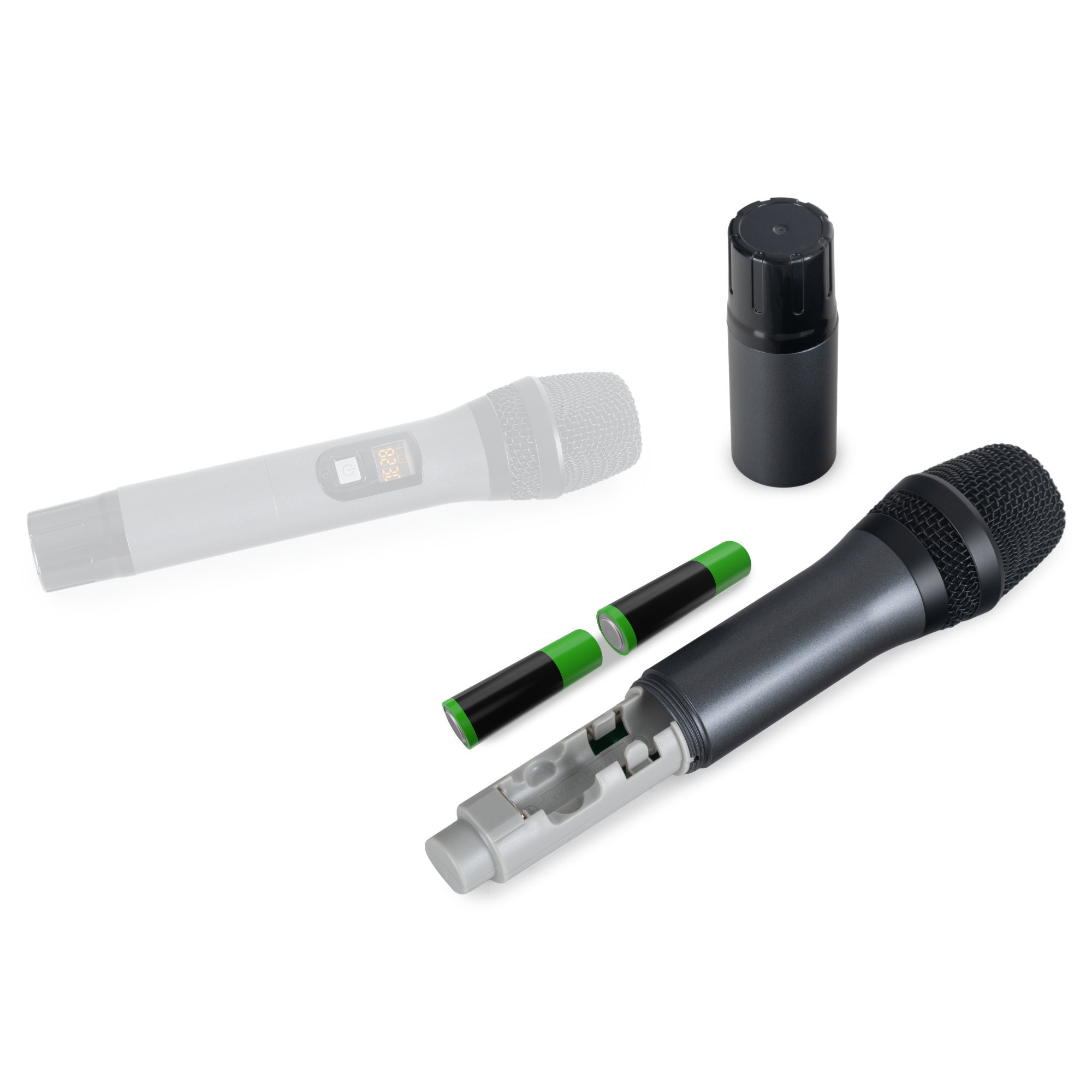 - Pro Mikrofon werden 2 AA-Batterien benötigt (nicht im Lieferumfang enthalten)