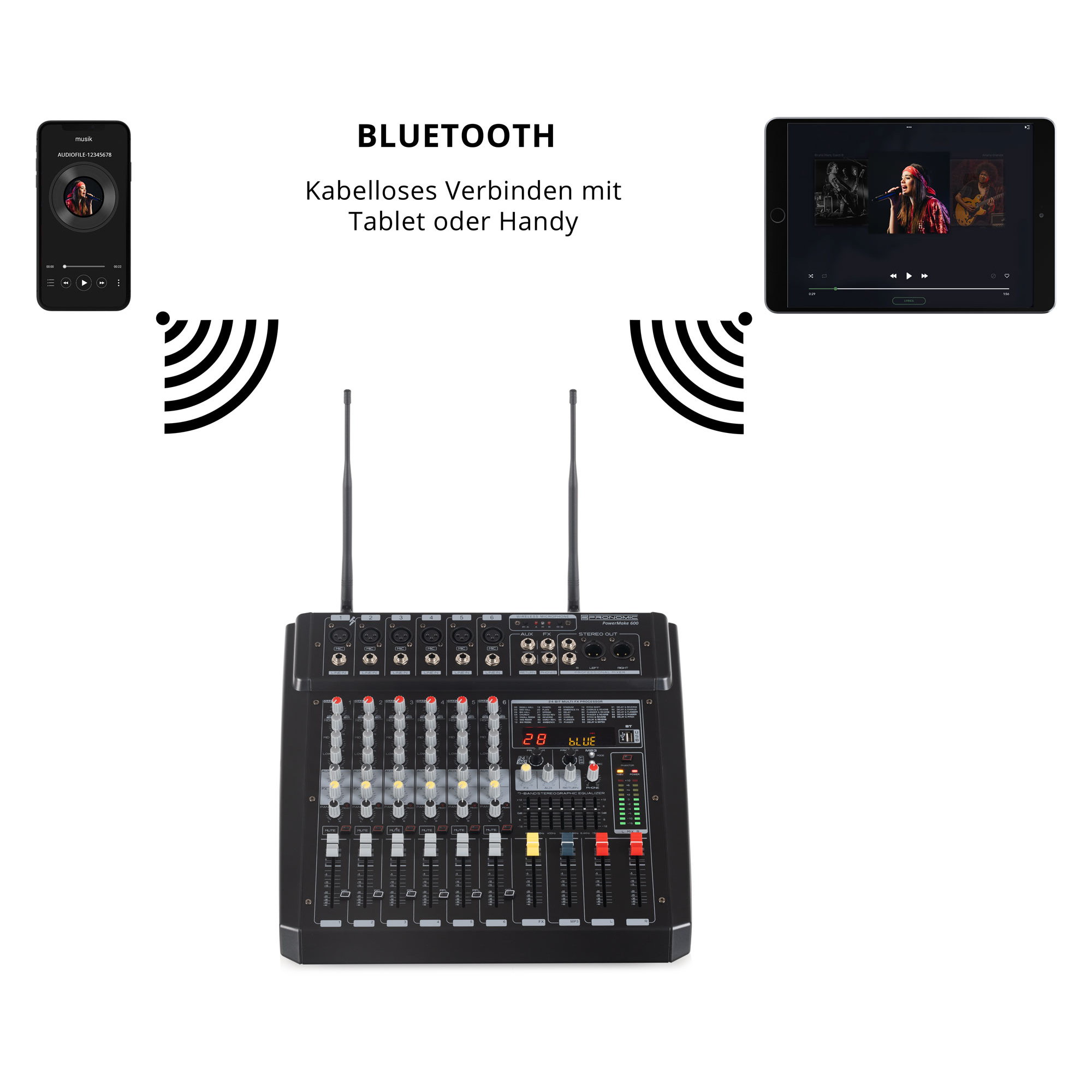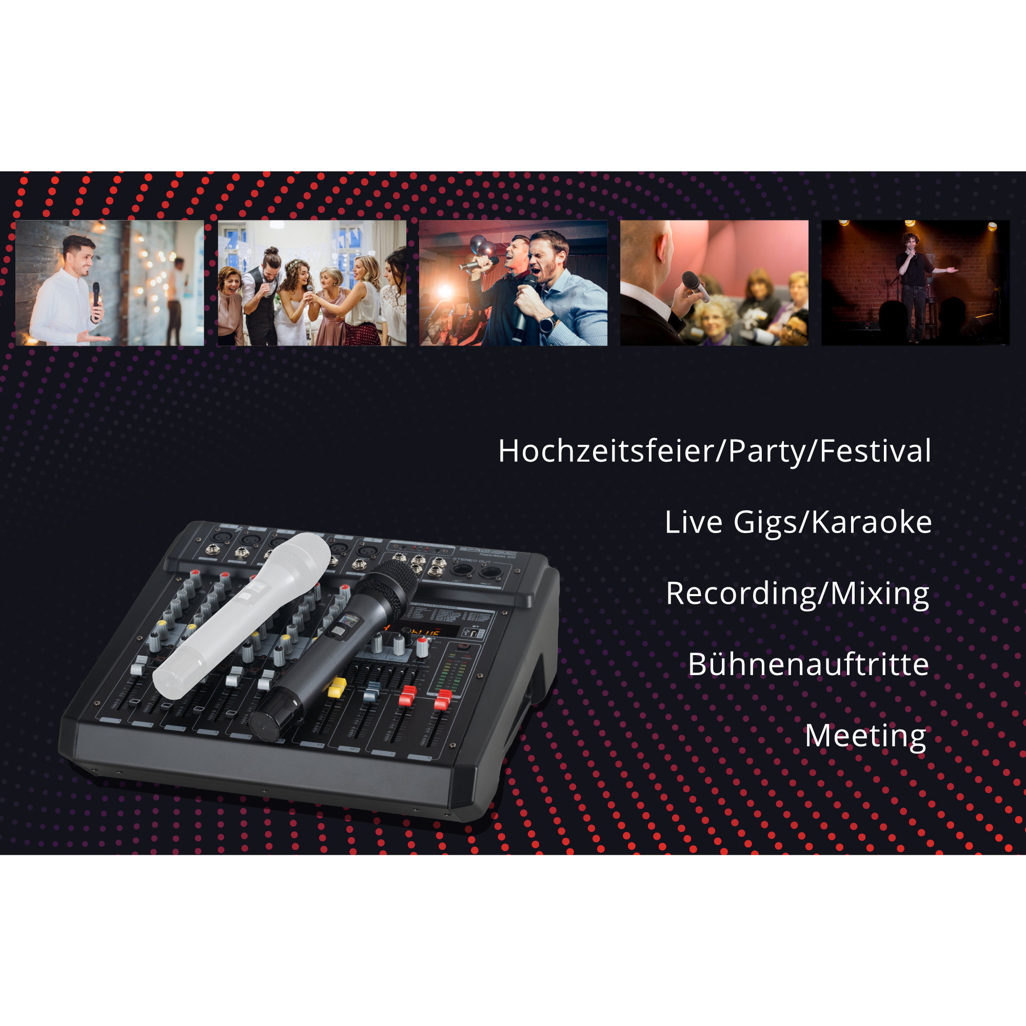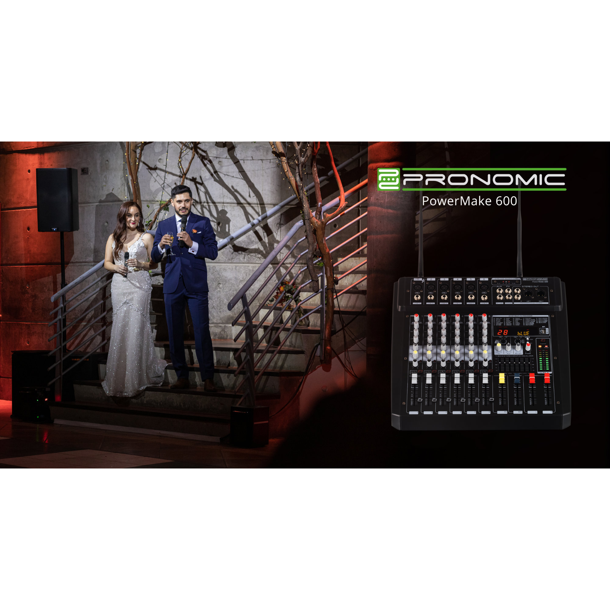 Der Powermake 600 ist der perfekte Powermixer für kleine Bands, welche auf Veranstaltungen wie Hochzeiten, Geburtstags- oder Firmenfeiern für Stimmung sorgen. Zahlreiche Anschlüsse ermöglichen ein flexibles Setup inklusive Monitoring und die beiden drahtlosen Mikrofone stehen den Gastgebern für Reden und Ansagen zur Verfügung.