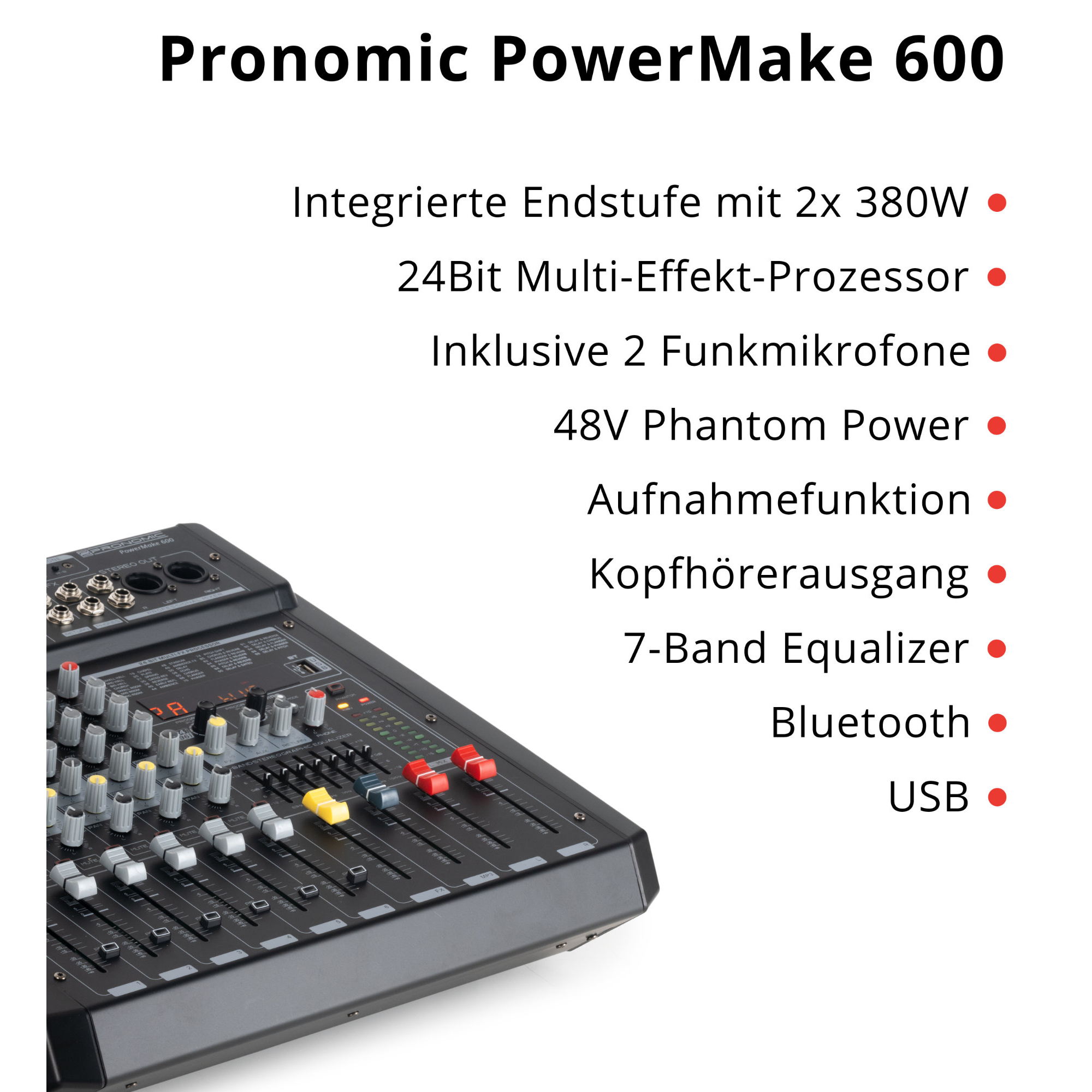 - Ingangen 6.3mm Klinke, Bluetooth, USB, XLR