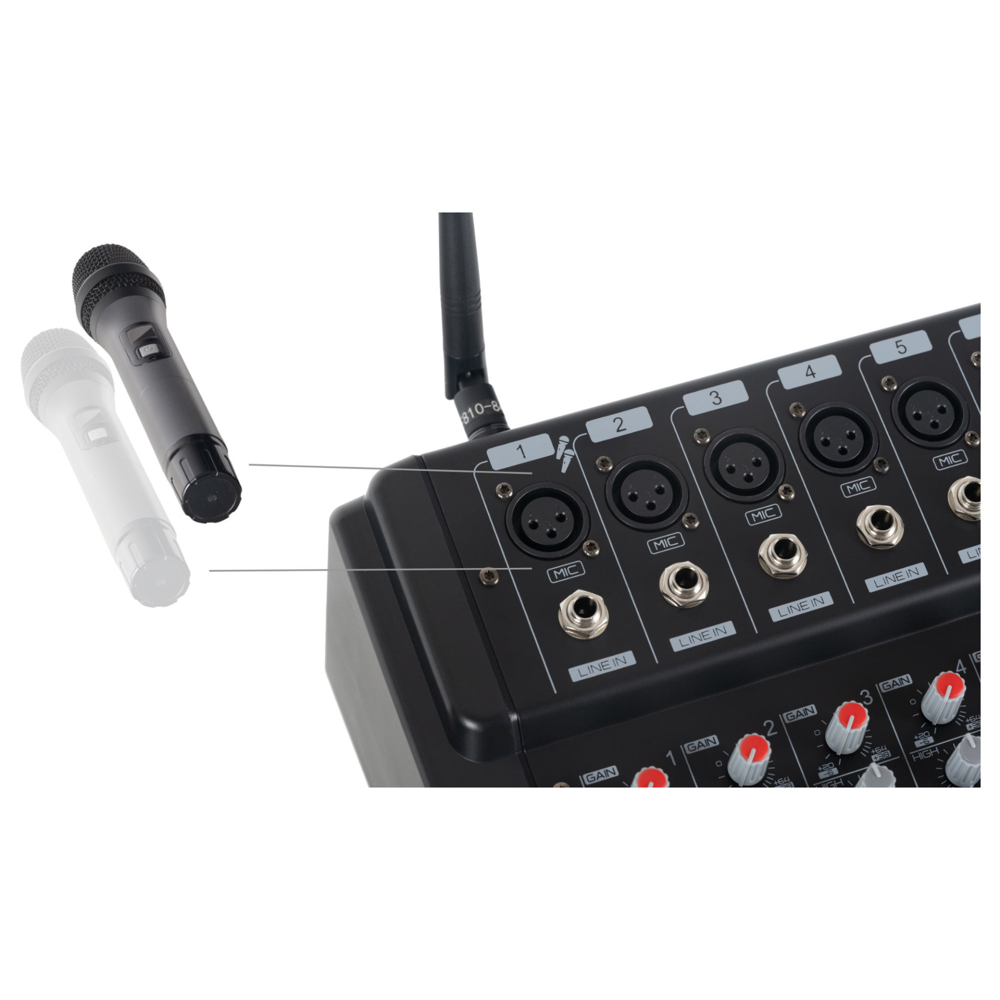 Wichtige Anmerkung: Beide Mikrofone belegen Kanal 1 des Mischpultes und teilen sich die Klangregelung dieses Kanals. Somit ist eine individuelle Klangbearbeitung der beiden Mikrofone nicht möglich.