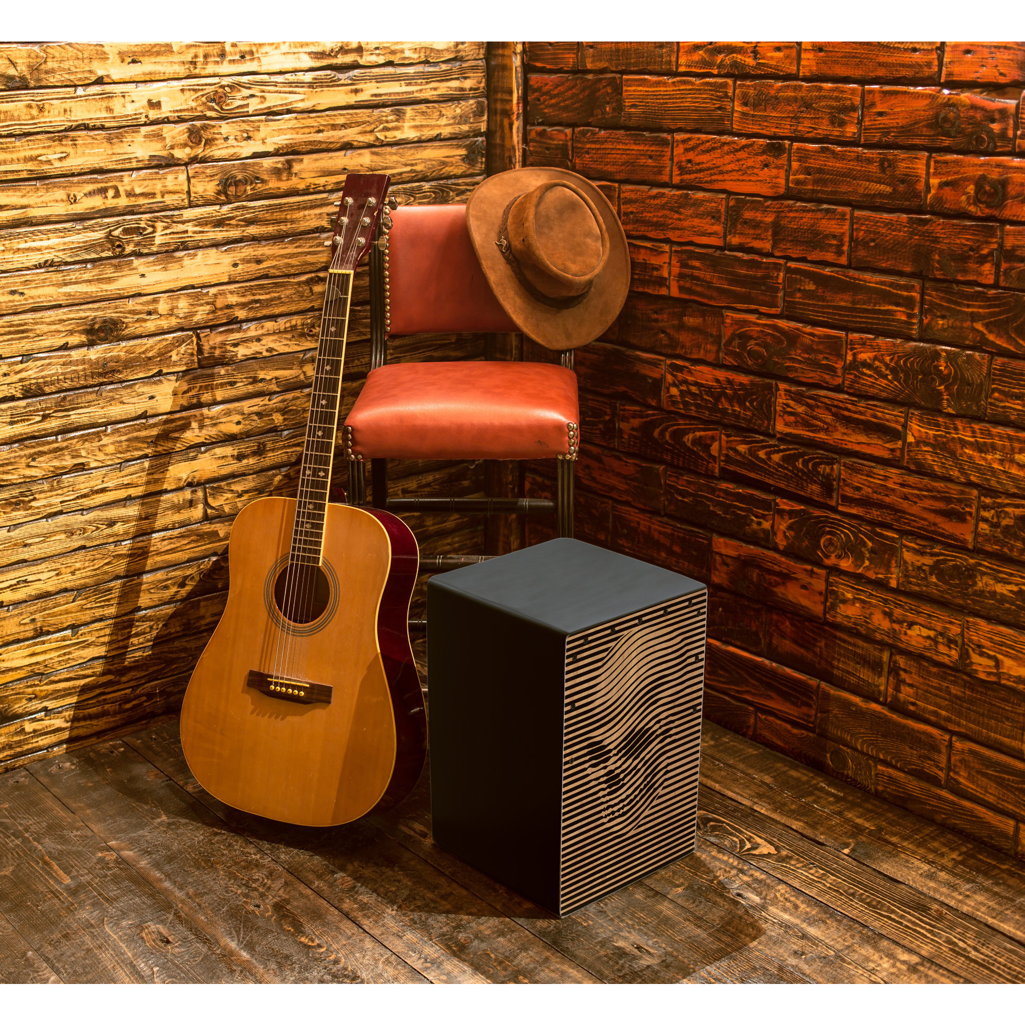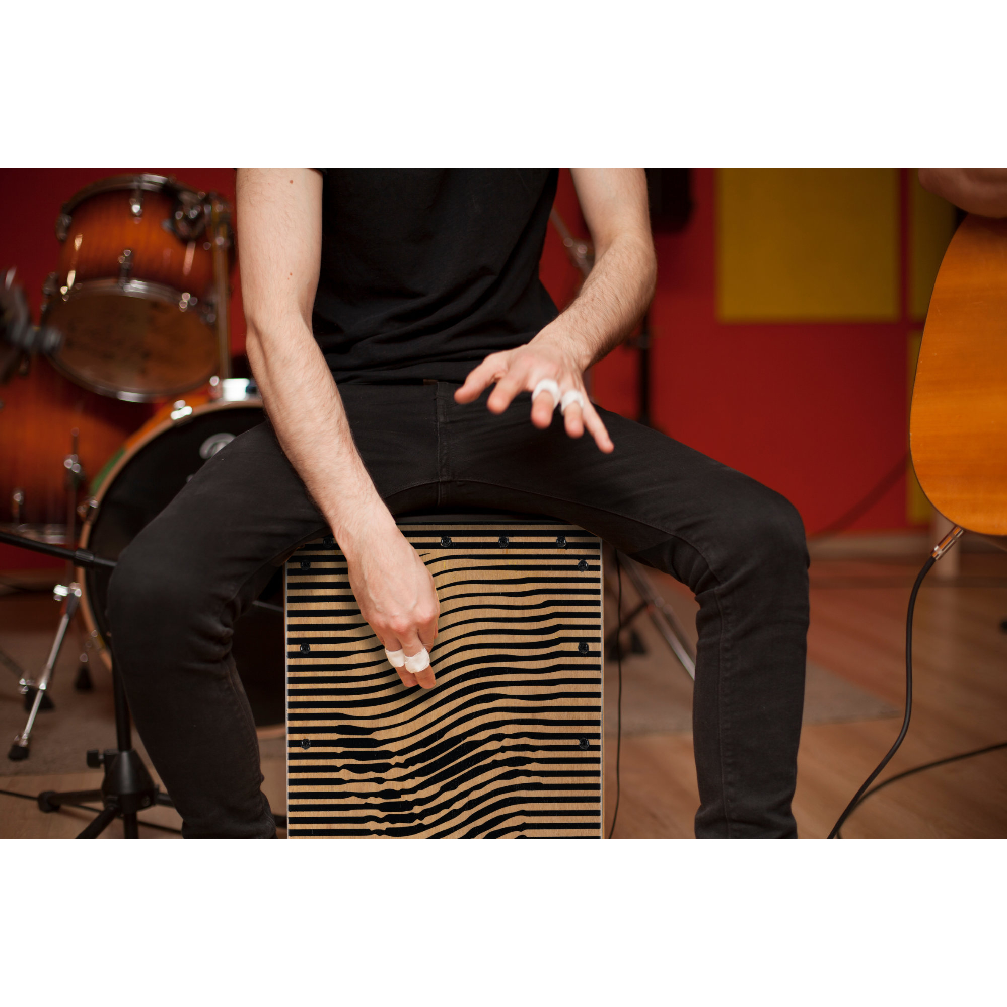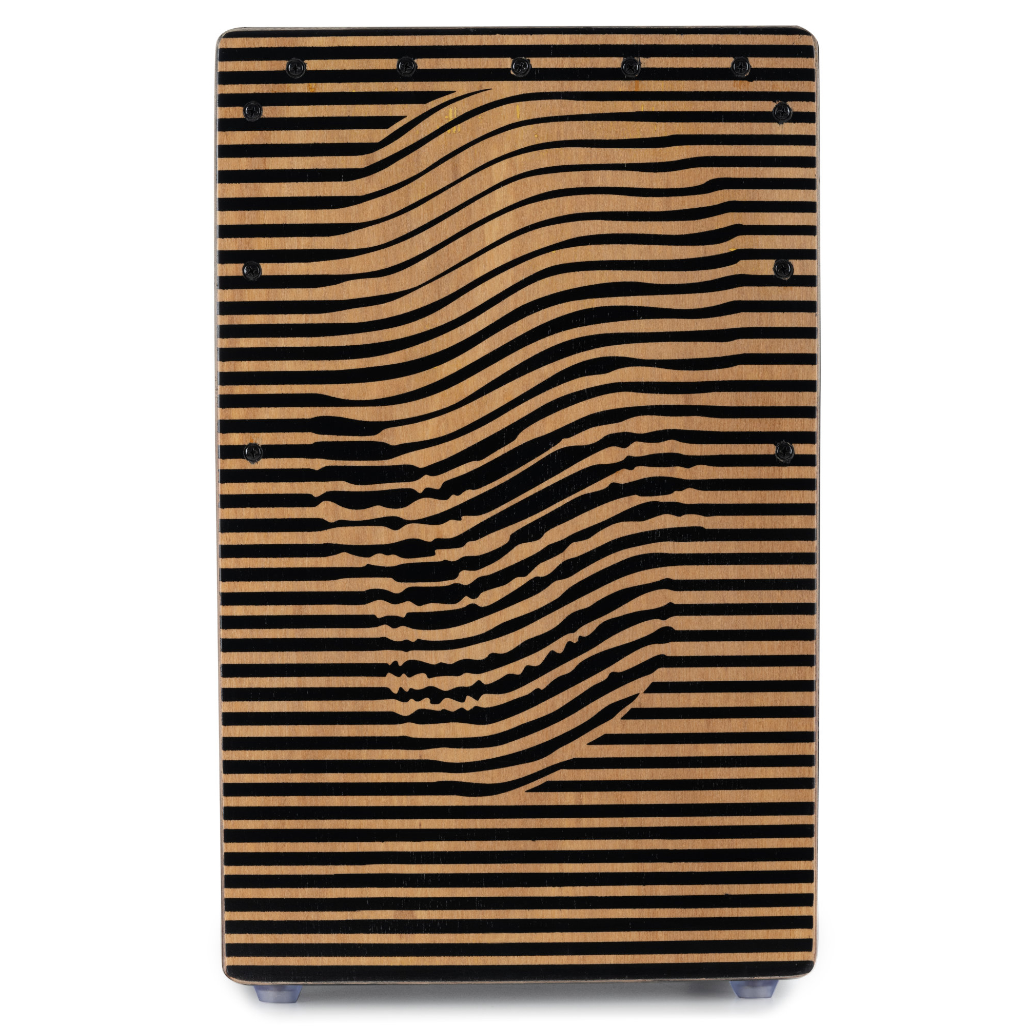 Der Korpus der Cajon ist in schlichtem Schwarz gehalten. Der ultimative Eyecatcher ist die bedruckte Schlagfläche, wodurch die Cajon auch während der Spielpausen stets im Rampenlicht steht.