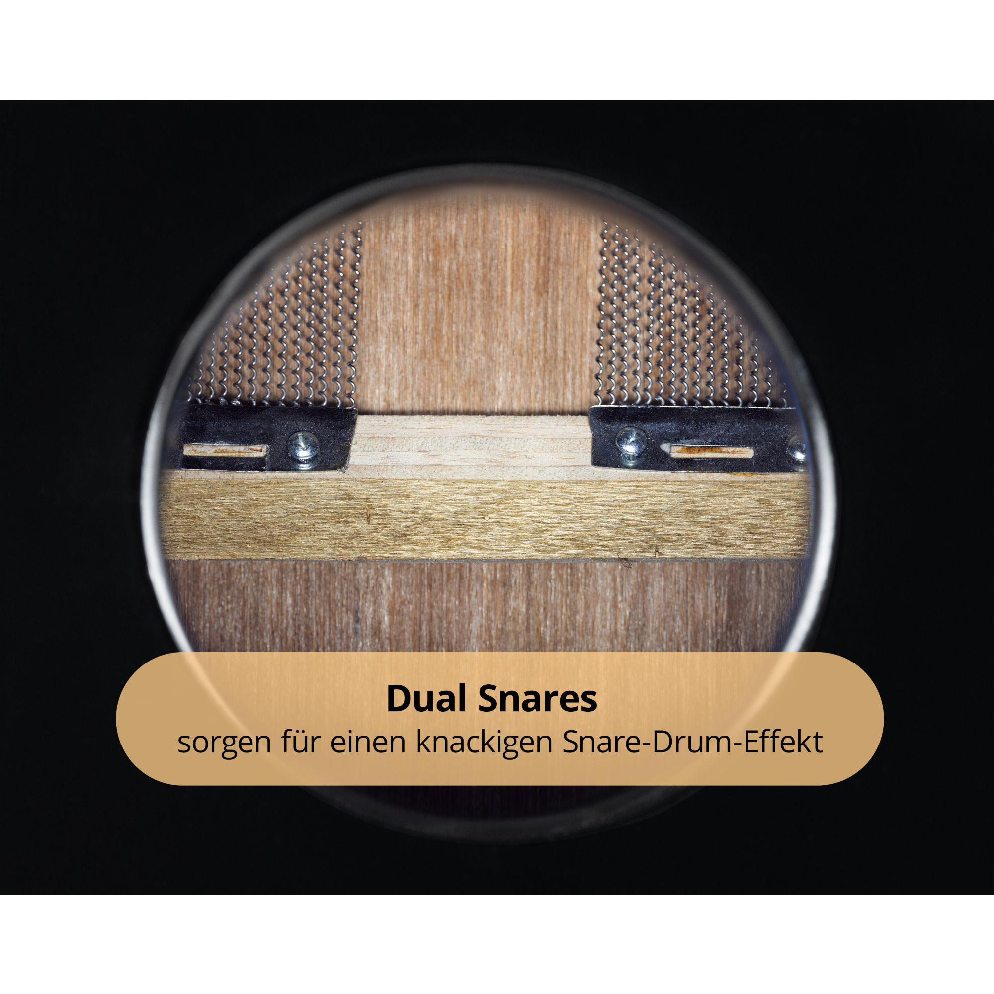 Um die Schläge an der Oberkante zu verfeinern, ist im Inneren ein 20-spiraliger Snareteppich angebracht, welcher beim Anschlagen der Cajon mitvibriert und somit für die typische Klangfärbung sorgt.